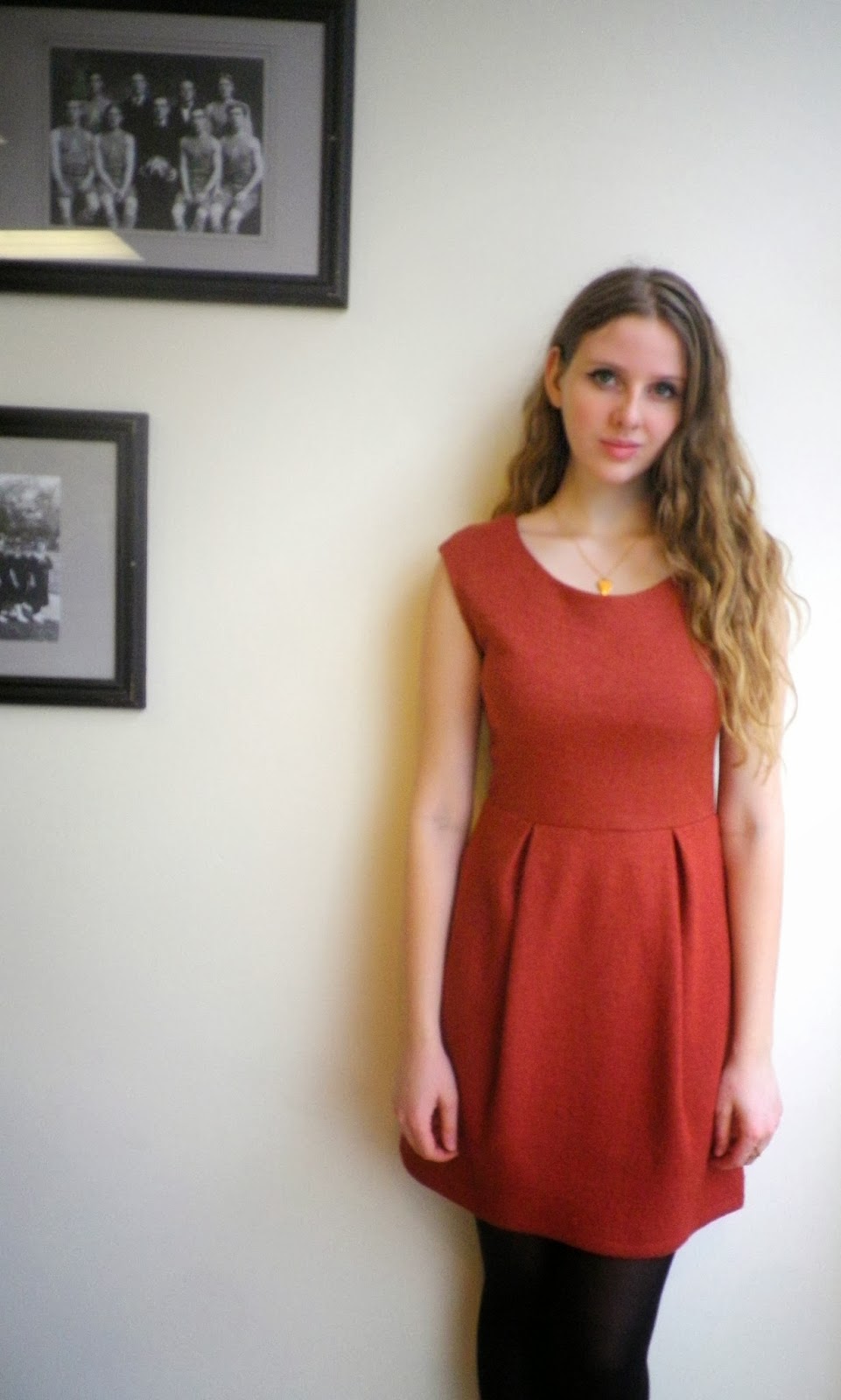 First is this boiled wool Dagg & Stacey dress. It's soft pumpkin colour is flattering on most skin tones and although it's subdued, it still adds a nice touch of colour for a season that usually comes in grey and blue. It's as cozy as it is sophisticated and would look great paired with a cream or navy cardigan and a brown leather belt with a big gold buckle for some shine.