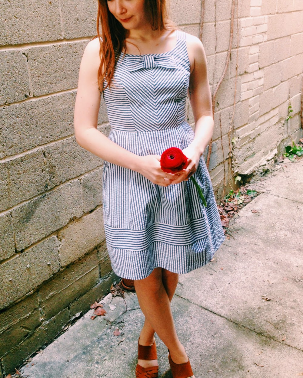 The Earthcreeper from Birds of North America is a fit and flare beauty in blue and white seersucker. It is 100% cotton and has side pockets, so not only is it cute - it's practical too! And as always, made in Canada with love by the amazingly talented Hayley Gibson. Hayley has been an independent designer for the last ten years thanks to customers like you!