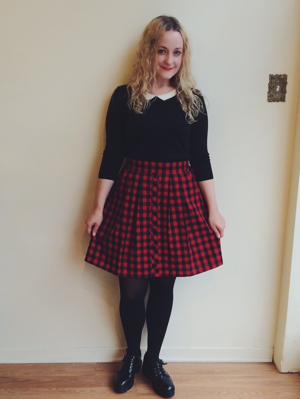 Next is one of my personal fave outfits. You can't say Fall without lumberjack plaid and what better way to wear it than in this sweet button front skirt from Birds of North America? It sits nice and high on the waist, perfect for tucking in blouses (or pairing with our favourite Hornero Crop top!). To go along with it is the Betina Lou Agatha top. Made from a bamboo knit, this little black top is complete with a sharp white collar. Seriously, we cannot get enough of collars this season!