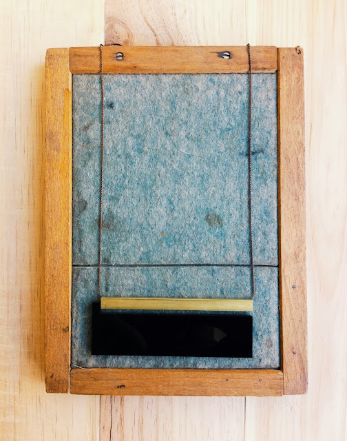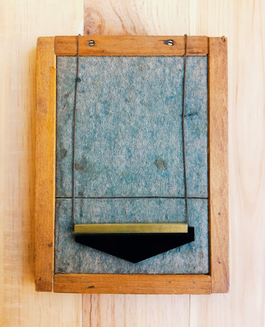 | square brass exrtrusion with hand applied patina finish with a laser cut acrylic pendant. $138. |