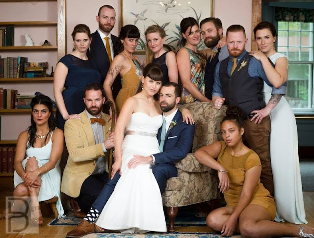 Another great example of how a bridal party wearing different dresses can still look totally unified. Bride Taralyn found dresses for each of her bridesmaids from Eve Gravel's Summer collection, while her groom and groomsmen are wearing ties and bow-ties from April Look. It is so fun to look at a group wedding shot and want to fully take it every single person's outfit. Doesn't this also look like a promo shot for the best & sexiest new HBO drama?