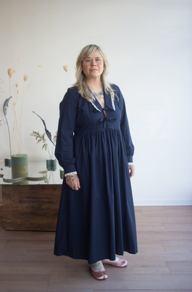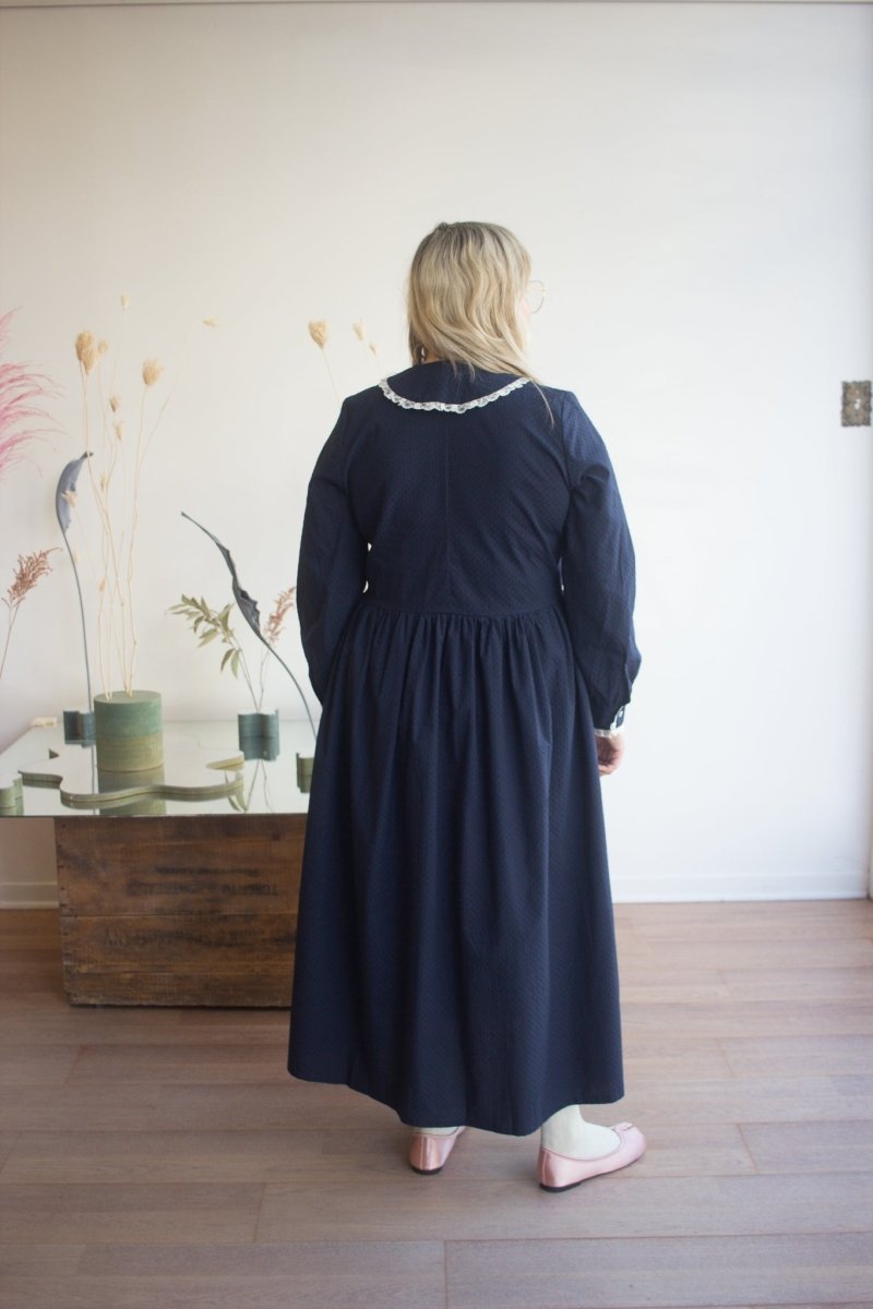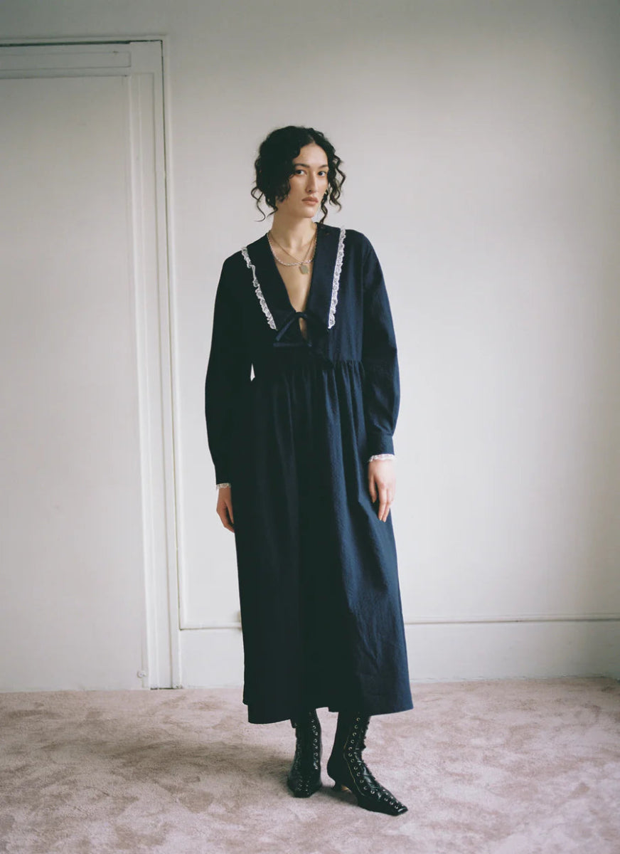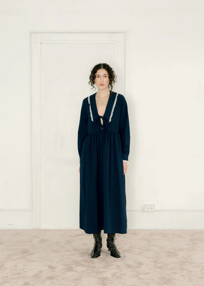 The Woolf Dress by A Bronze Age is a charming maxi dress designed to make an impression. Featuring long sleeves and a playful sailor collar trimmed with delicate cream lace, this navy dimple dress combines timeless elegance with a touch of whimsy. Its flowing silhouette moves gracefully with you, perfect for everything from casual days out to special occasions. Dress it up or down—you’ll love how effortlessly it blends classic style with a fresh, playful vibe!