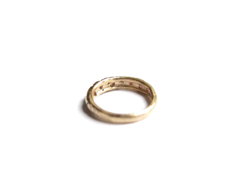 A one of a kind ring by Elaine Ho done in a solid 14K yellow gold band featuring 7 rubies and texture.