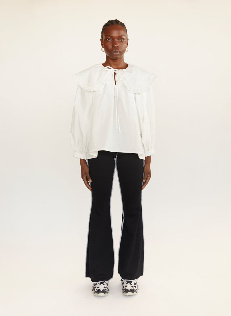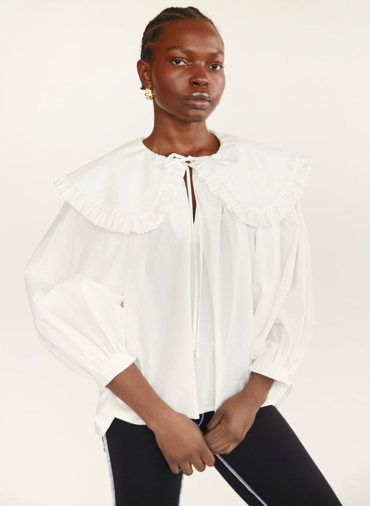 Eliza Faulkner's Sawyer Top is back for another season and we couldn't be happier. This is one of the longest-running and bestselling styles from the brand and for good reason. This whimsical cotton top has long puff sleeves, a relaxed fit in the body and a signature oversize collar that is ideal for layering under other pieces. We love this season's update with the contrast tie details. You'll be reaching for this one all the time.