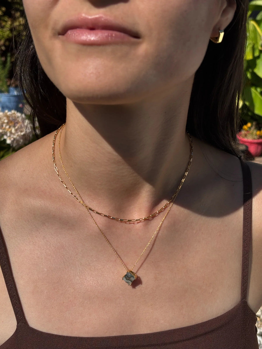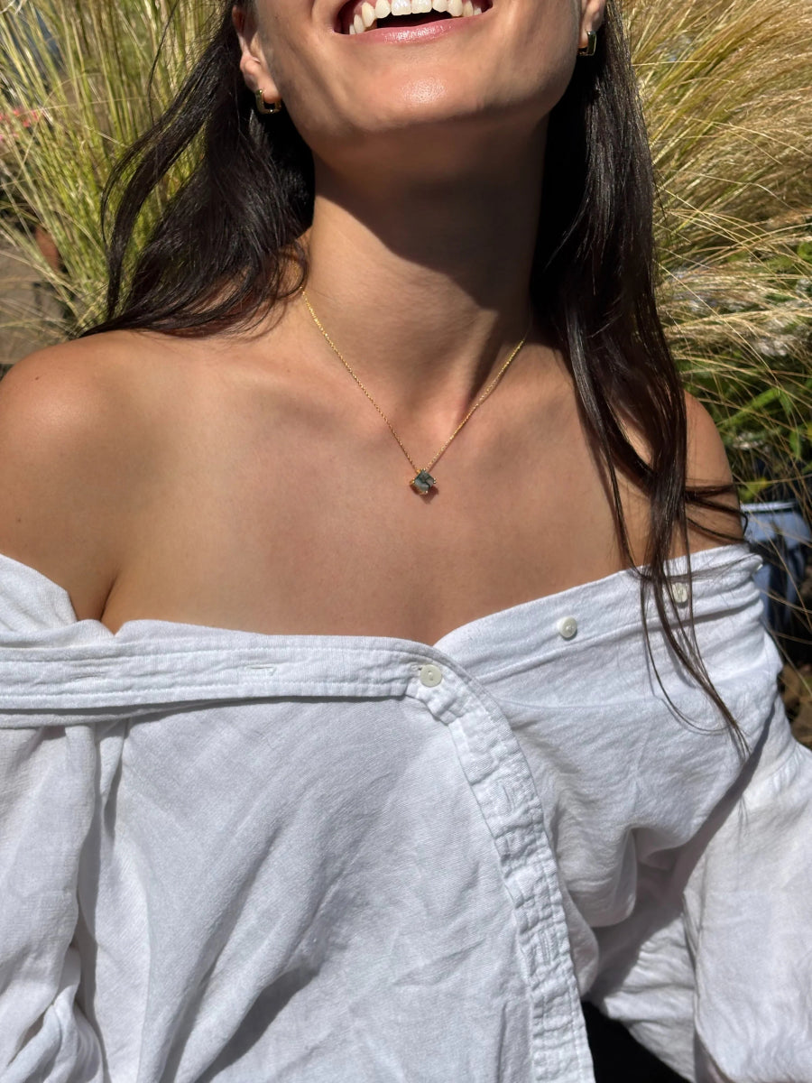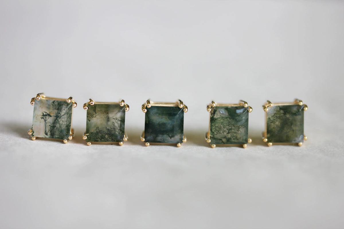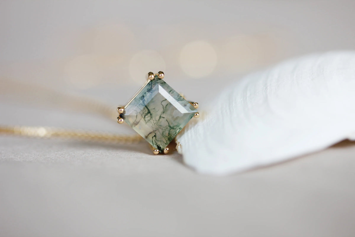 Little Gold's Tidal Pool pendant is a little diamond shaped Moss Agate, like a tiny tidal pool. Each stone is completely unique - some are darker, some are lighter, all equally beautiful.