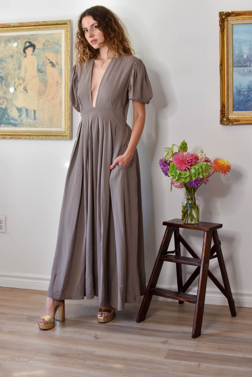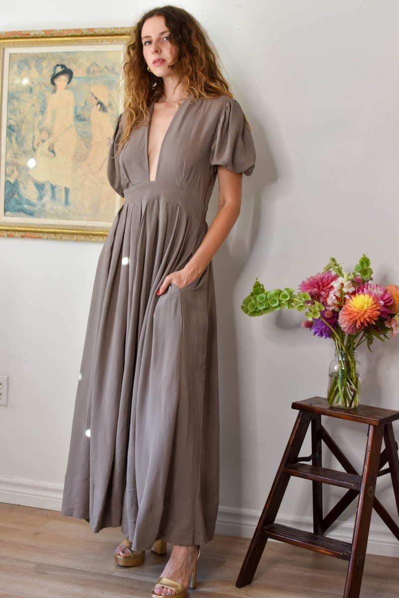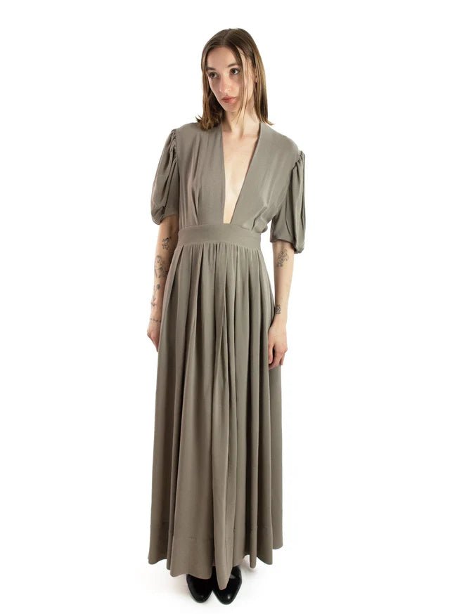 The Pretty Gown by Meg is a timeless and romantic maxi style with a dramatic deep V-neck, pleated details, and fluid drape. Effortless, elegant, and ready for any occasion. The Pretty Gown has pockets, an invisible back zipper, a structured high waist, and darling puff sleeves. Perfect to wear to a nice dinner or a formal event!