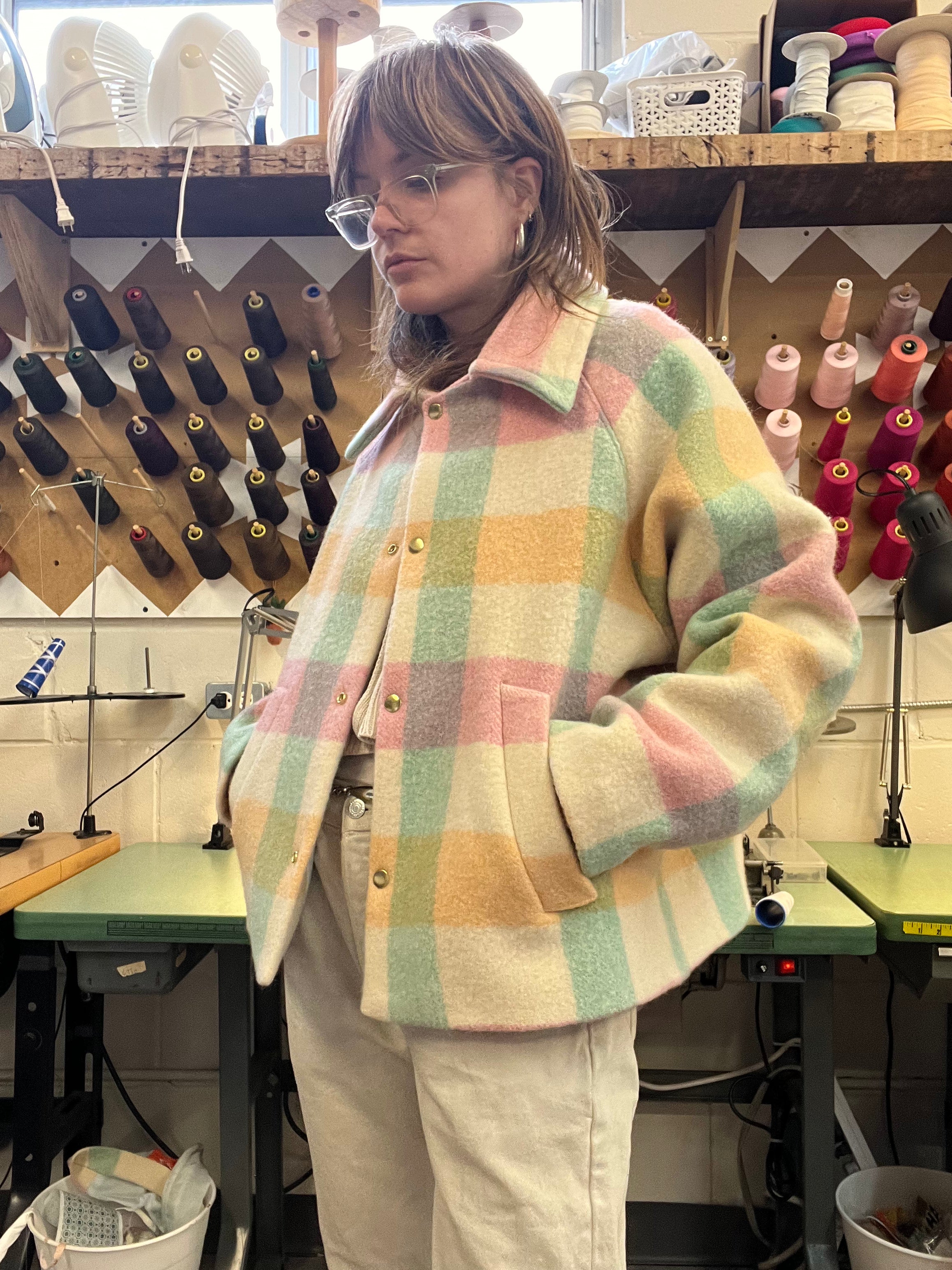 This one-of-a-kind jacket by Sweet Juju is handmade from a pre owned mid-century wool blanket which was originally woven in Scotland. The jacket is a cropped length and features flattering raglan sleeves, a classic pointed collar, and welt pockets. It closes with 4 brass metal snaps. The lining is soft Bemberg rayon. The blanket is thick and warm with no stains or holes.