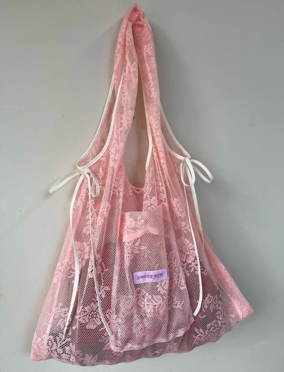A darling handmade tote bag by Sweet Juju made from a second-hand lace curtain, dyed pink with two lace bows and two antique mother of pearl buttons in the shape of apple blossoms.