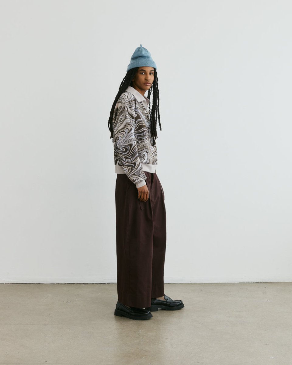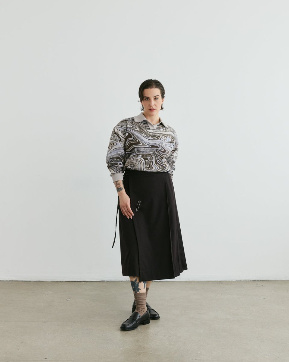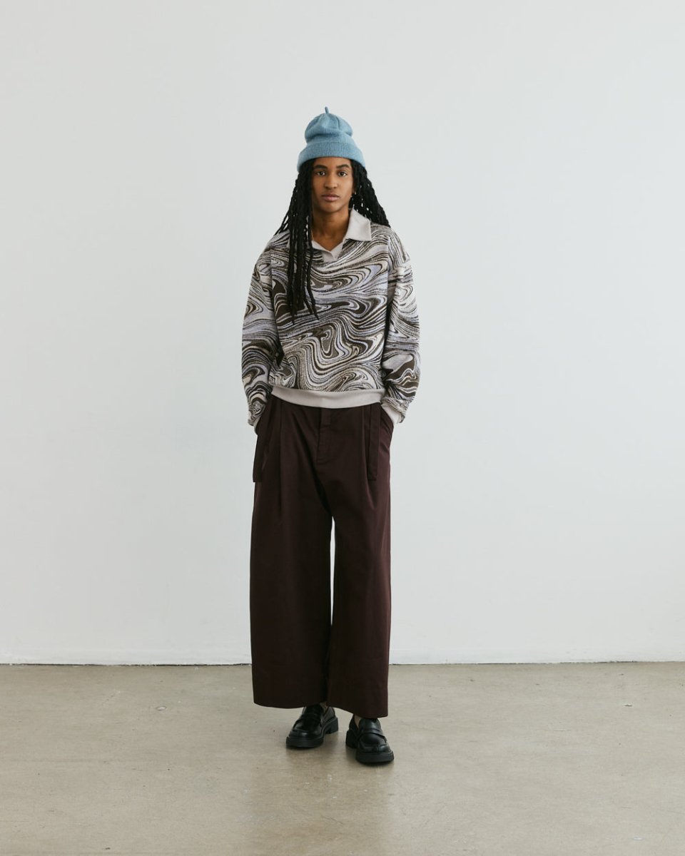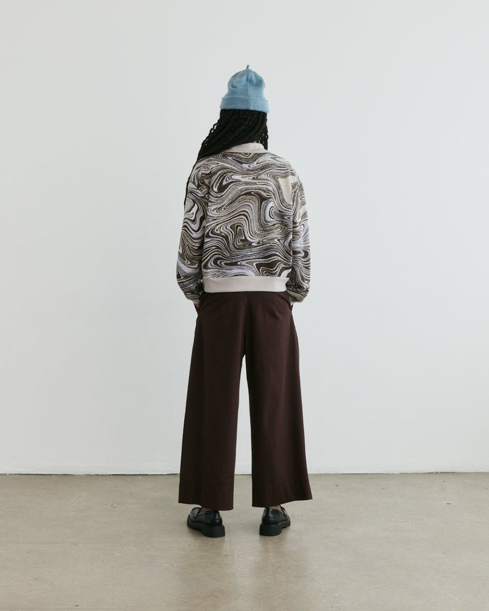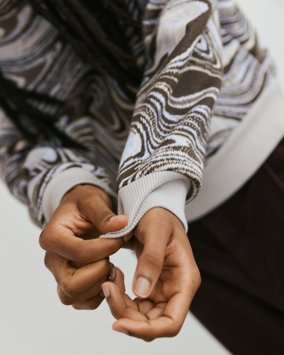 Add some razzle dazzle to your wardrobe with Veri's Swirl Sweatshirt! Crafted from a unique, hazy deadstock fabric found in Montréal’s fashion district, its boxy fit and relaxed Johnny collar make it effortlessly comfortable, and eye-catching. Perfect for spicing up any outfit, pair with any ol’ pair of denim or have fun with it, and mix it up with another motif!