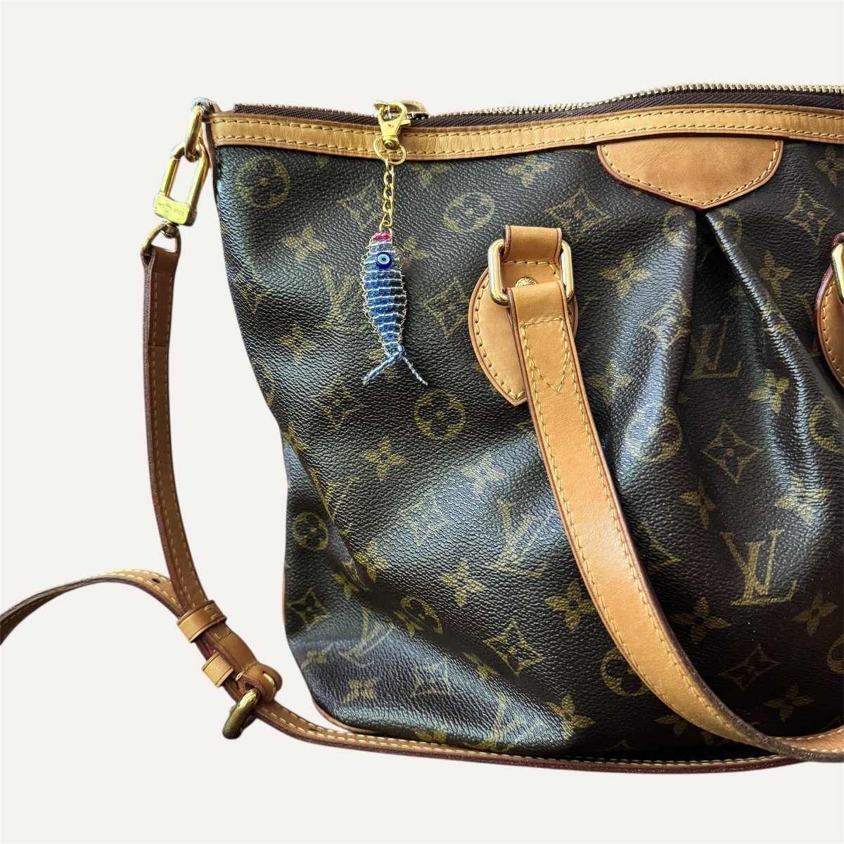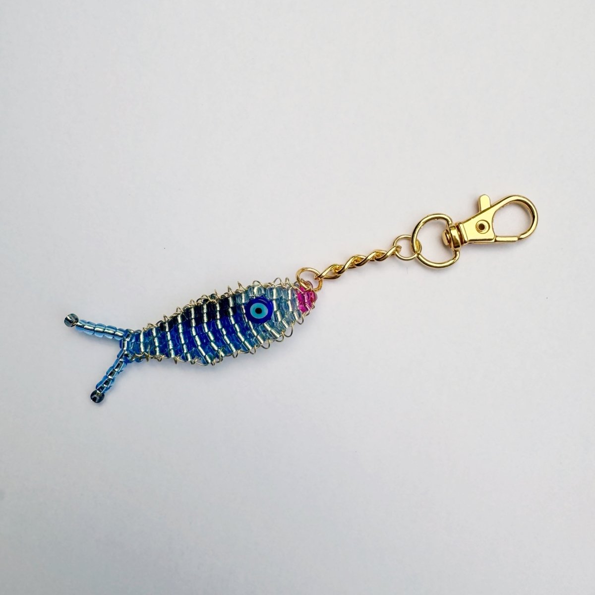 Meet your new lucky catch! A handcrafted beaded bag charm that makes every bag pop with personality. Featuring a strand of eye catching glass beads plus a handbeaded fish finished with traditional evil eye beads, long thought to protect against envy and invite good fortune.
