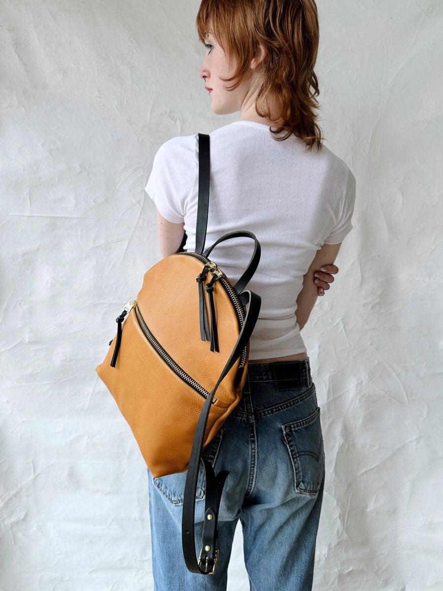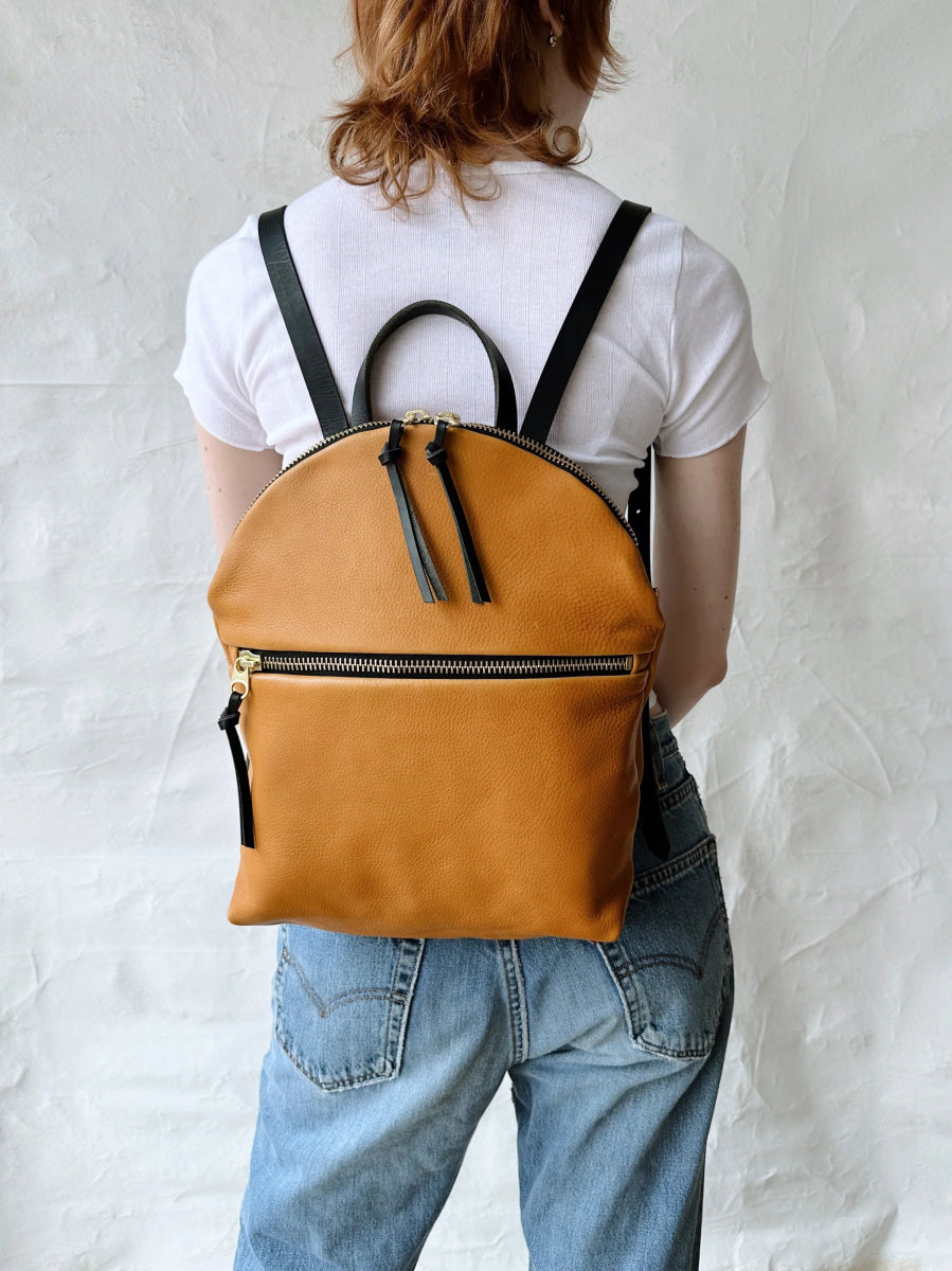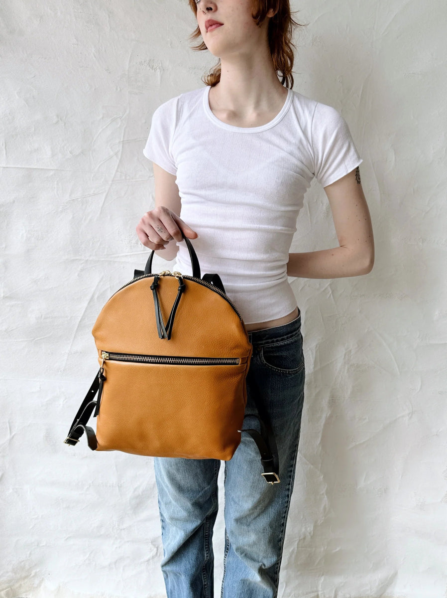 Simple and sleek, this is the grown up backpack you've been looking for. The Anni Large Backpack is the perfect leather backpack for commuting or for lighter trips. This backpack fits a 13" laptop and has a 12" zippered pocket on the front. Made from buttery, chestnut coloured, organically tanned leather that will darken and get better with age. This leather has been produced using organic materials as opposed to environmentally harmful chemicals. It has a nostalgic, earthy smell, and a tough durable feel. It will develop a patina over time, like beautifully worn in saddle.
