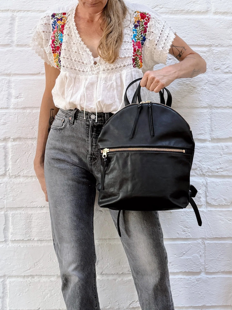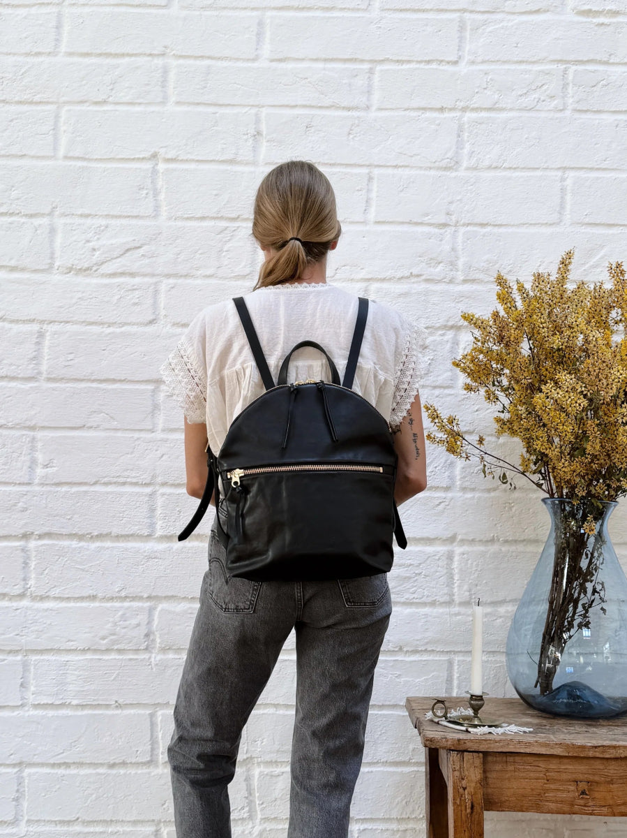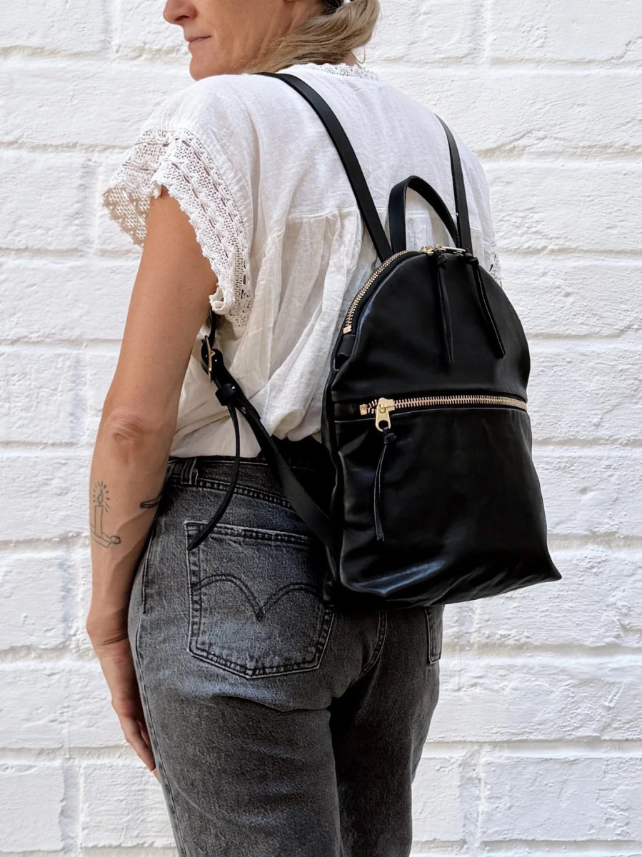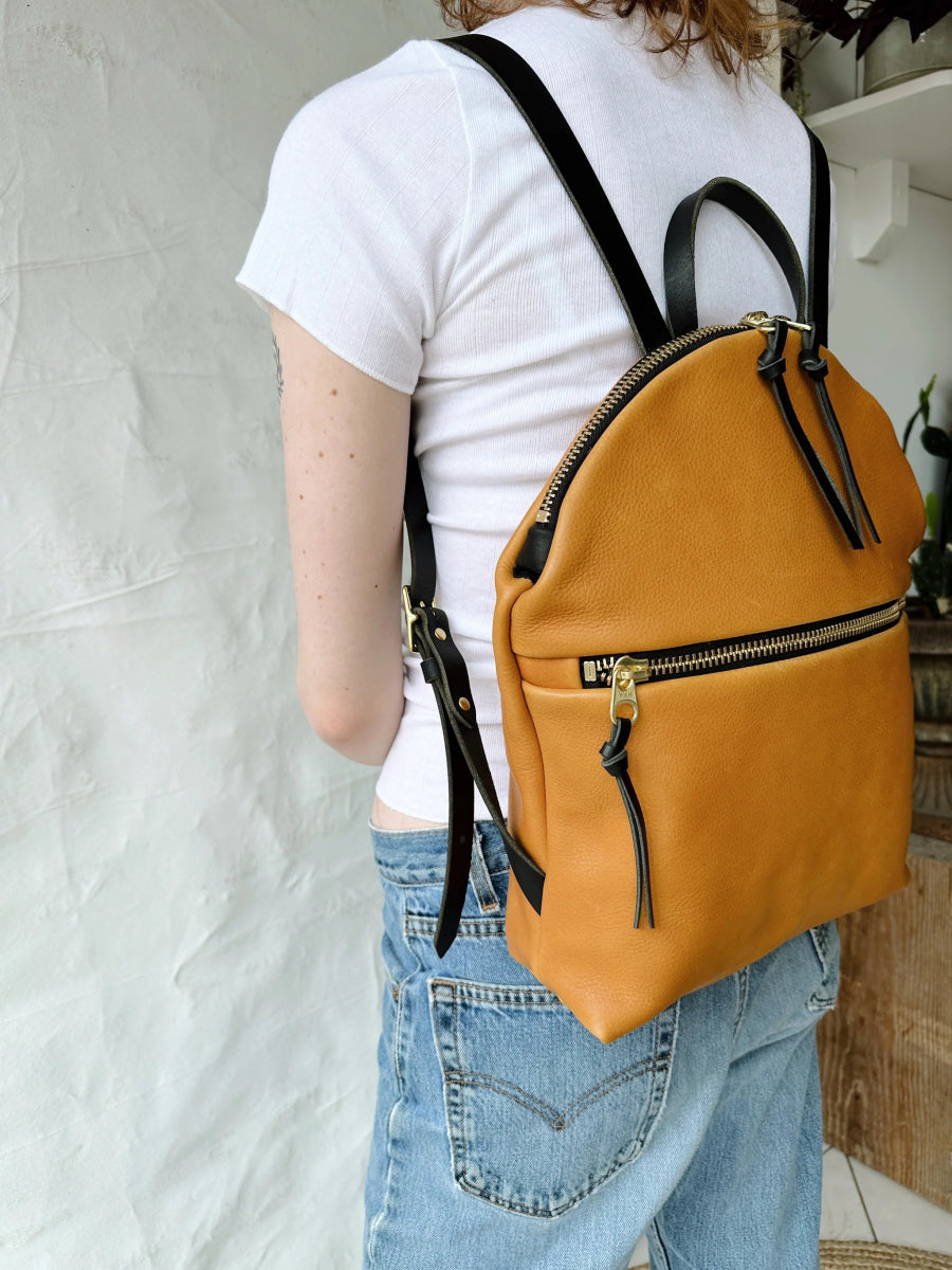 Simple and sleek, this is the grown up backpack you've been looking for. The Anni Large Backpack is the perfect leather backpack for commuting or for lighter trips. This backpack fits a 13" laptop and has a 12" zippered pocket on the front. Made from buttery, chestnut coloured, organically tanned leather that will darken and get better with age. This leather has been produced using organic materials as opposed to environmentally harmful chemicals. It has a nostalgic, earthy smell, and a tough durable feel. It will develop a patina over time, like beautifully worn in saddle.
