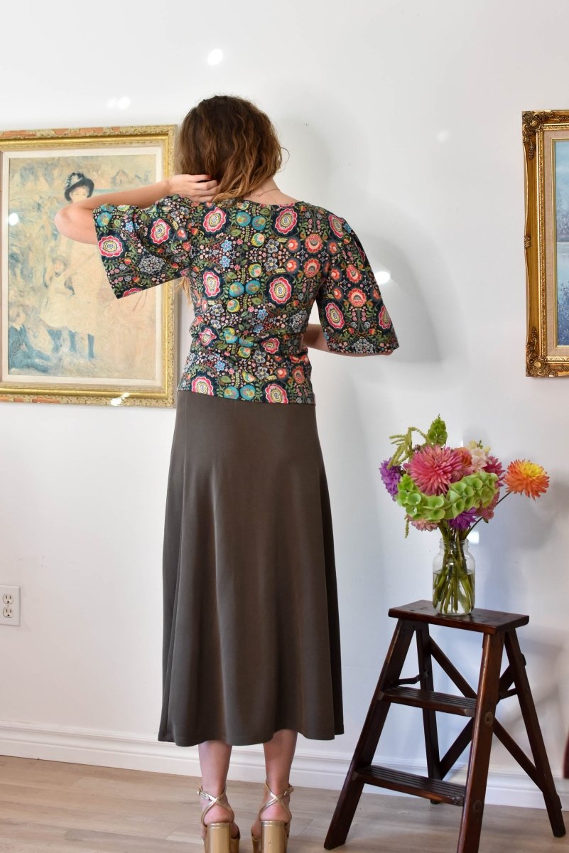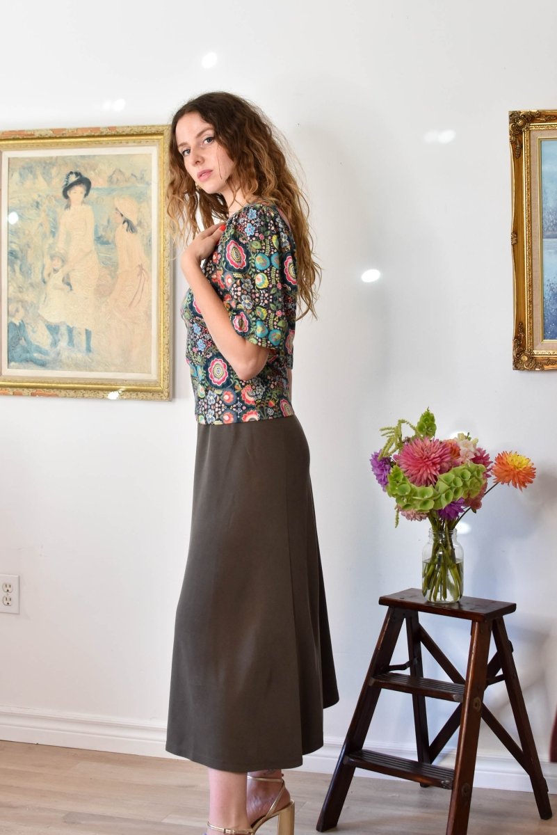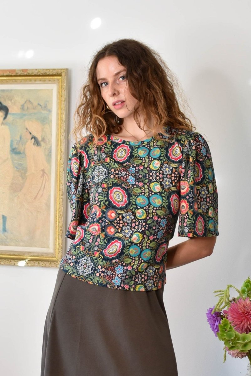 The Peahen Top by Birds of North America is a crew-neck knit top with an elbow length full sleeve that is gathered at the shoulder. The fabric is a soft cotton jersey that is a cotton and spandex blend allowing for a good amount of stretch while maintaining comfort and shape. We love this print with it's dark green background with a richly hued palette of abstract flowers and foliage!