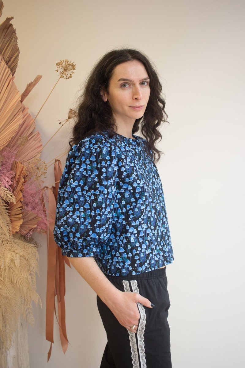 Birds of North America's Serin Top is a sweet and relaxed blouse for work or play. It has beautiful full sleeves and a front button placket. The length is great for tucking in or leaving out. Pair it with jeans, trousers or skirts! This magical print features luminescent blue mushrooms on a starry-sky black background. To make it even more special, the caps of the mushrooms and the stars actually glow in the dark!