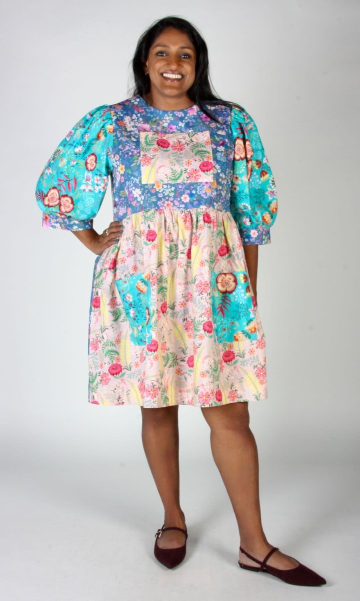 Birds of North America's Fairywren Dress is a super fun dress made from two end-of-the-roll deadstock cotton prints! This dress has a very similar fit to their Devil Downhead style with puffy sleeves, an empire waist and patch pockets. We love the contrast and fun of all the fabrics together! Go full maximalist and pair this with bright tights and huge colourful earrings. It has a very relaxed fit, and can be worn larger or smaller and still look fantastic! It pops on over the head and closes at the back with a button and loop.