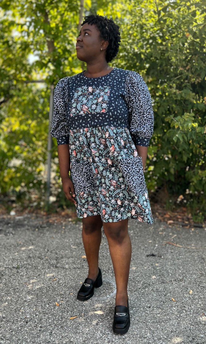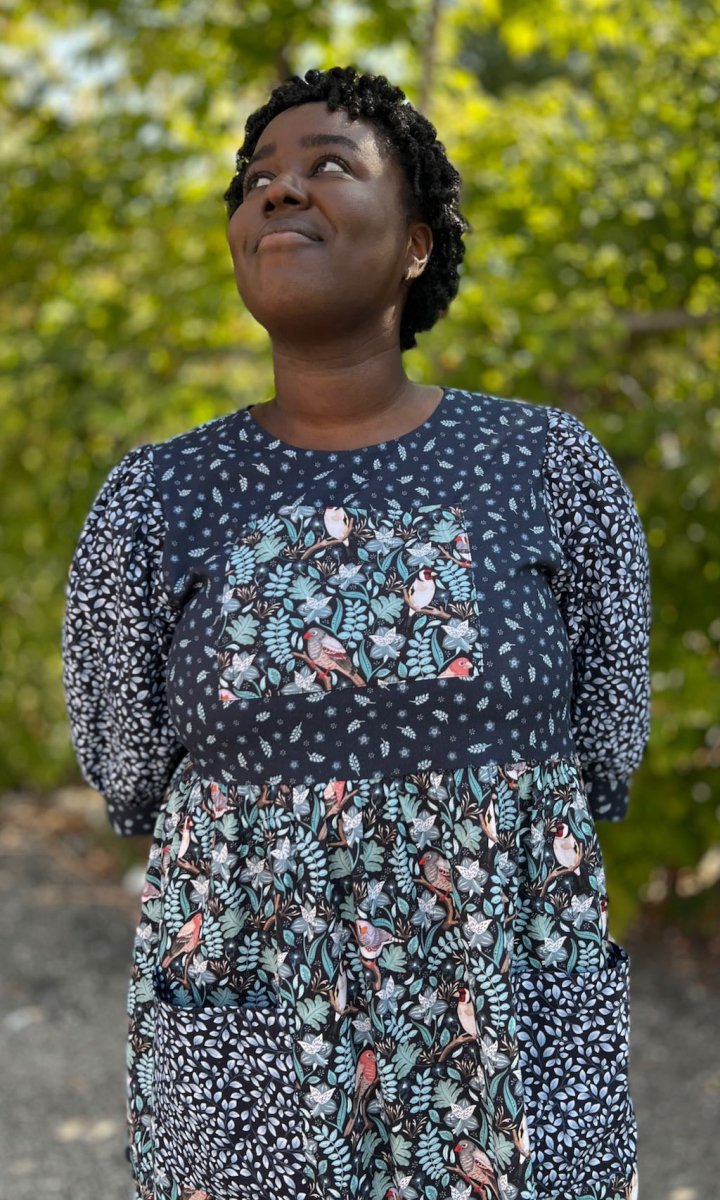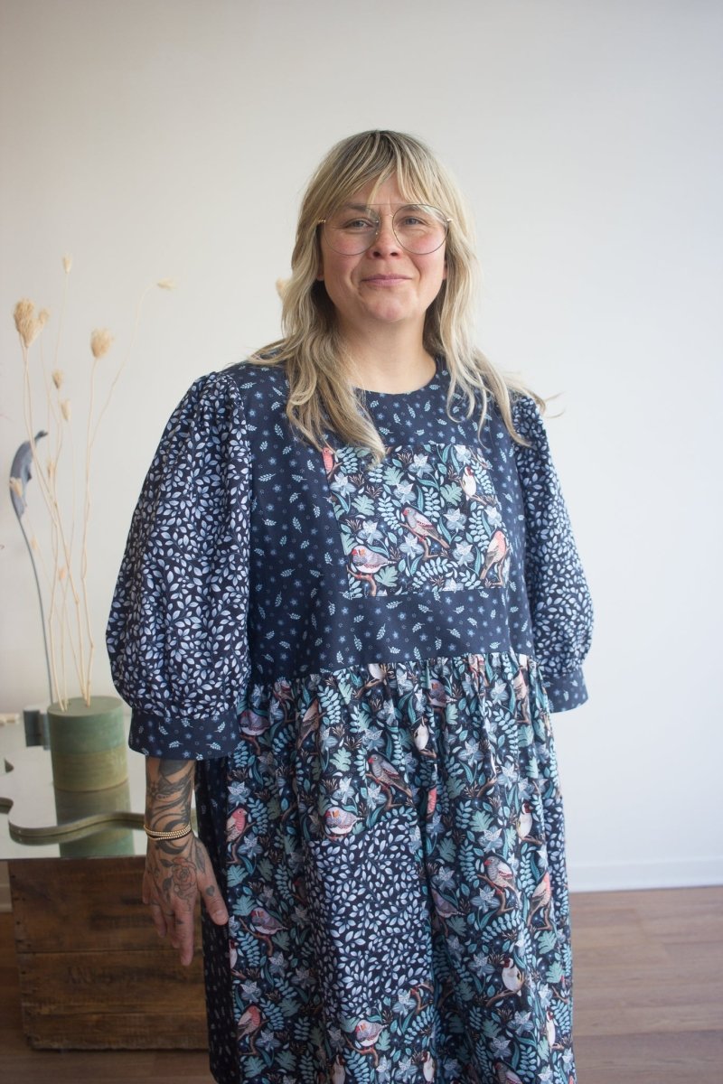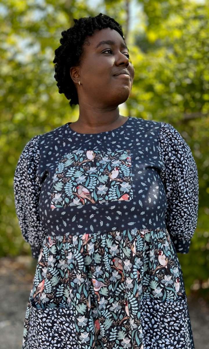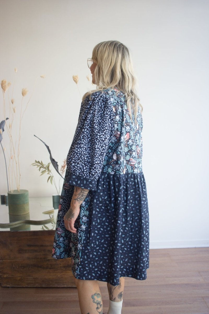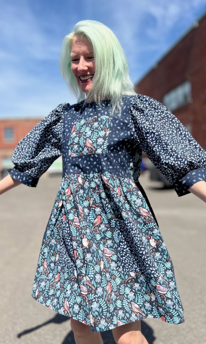 Birds of North America's Fairywren Dress is a super fun dress made from two end-of-the-roll deadstock cotton prints! This dress has a very similar fit to their Devil Downhead style with puffy sleeves, an empire waist and patch pockets. We love the contrast and fun of all the fabrics together! Go full maximalist and pair this with bright tights and huge colourful earrings. It has a very relaxed fit, and can be worn larger or smaller and still look fantastic! It pops on over the head and closes at the back with a button and loop.