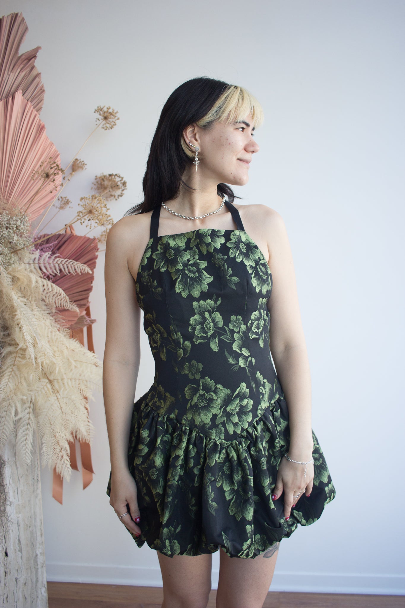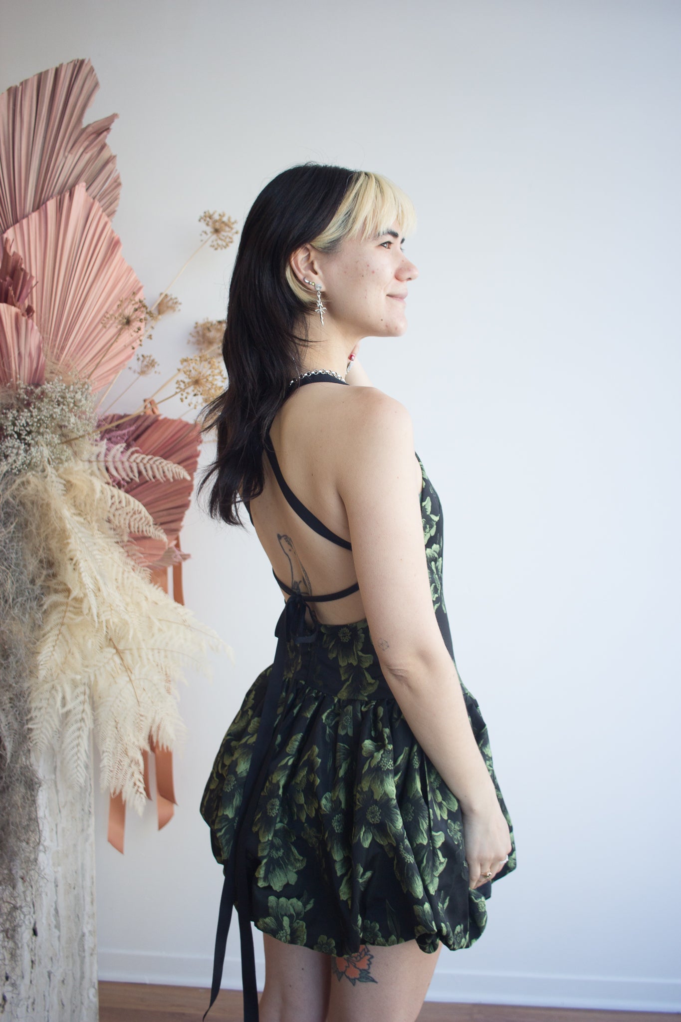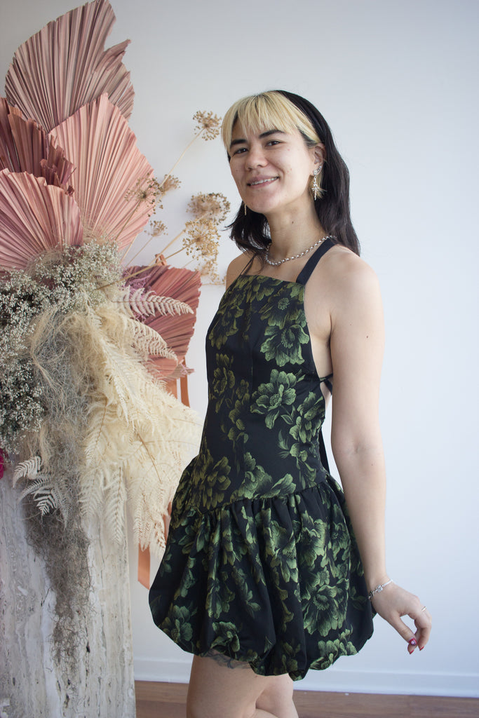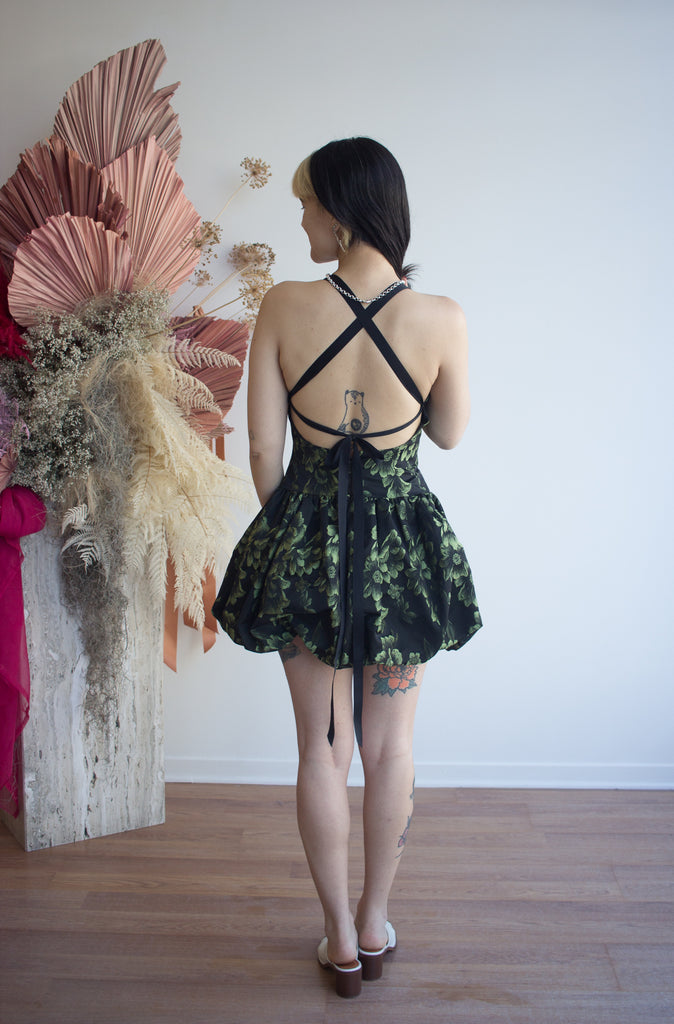 Eliza Faulkner's Lila Dress is full of delight and charm! With its lively floral print and flattering cut, this dress is perfect for twirling through sunny afternoons or dancing the night away. The body is fitted with a basque waistline and open back that closes with a criss-cross ribbon ties. She's risque, she's playful, she's flirty! Complete with a mini bubble skirt, an ode to the mid 2000s resurfacing bubble skirt. The Lila feels simultaneously vintage and ultra modern.