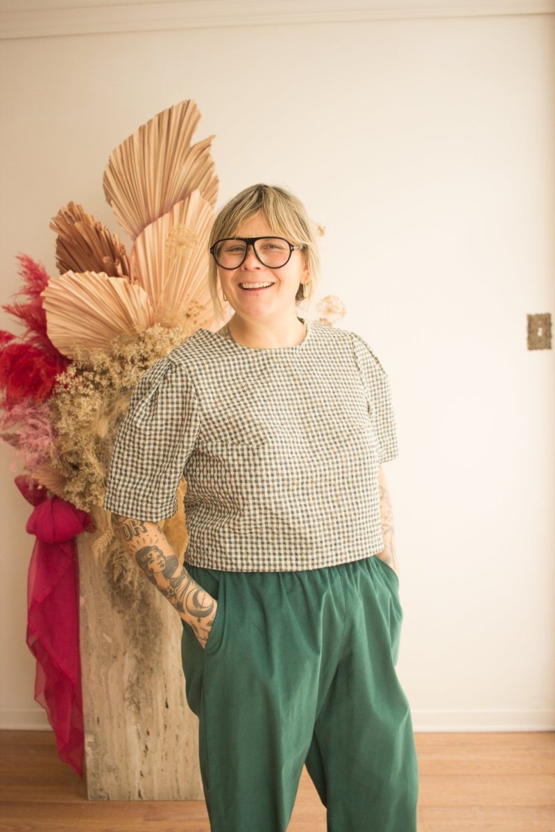 The Elpha Top by Eve Gravel is a straight and short cut accentuated by a subtle wide crease on the slightly puffed sleeves. Made from a lightly textured checkered print the Elpha offers clean lines with a playful touch. It's perfect to wear with a high waisted pant or skirt for an effortlessly feminine fit!