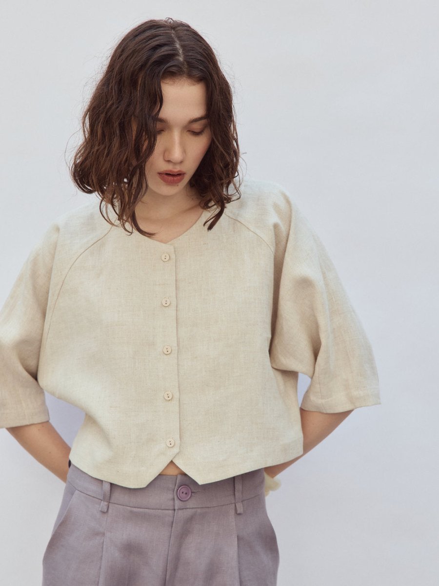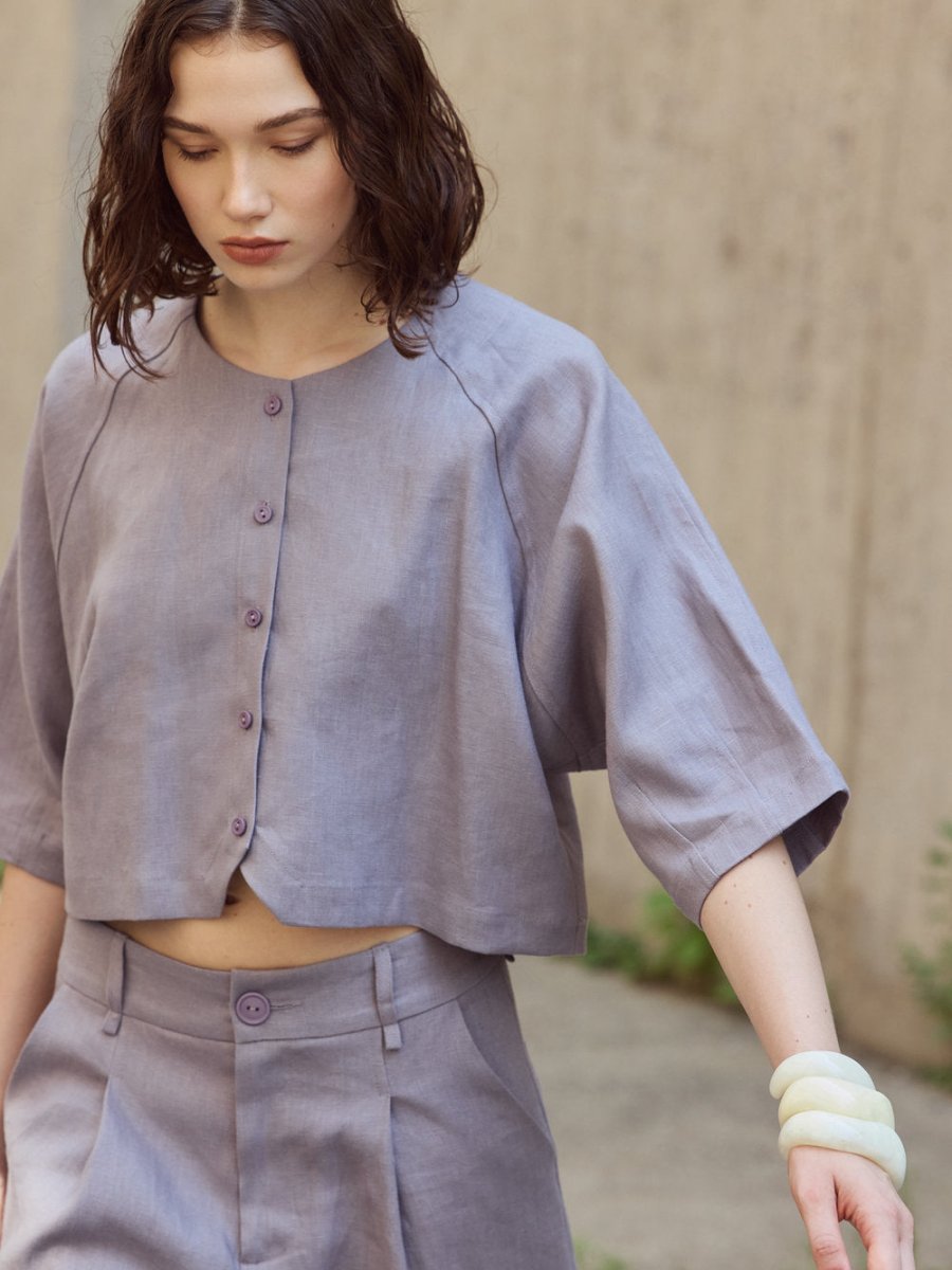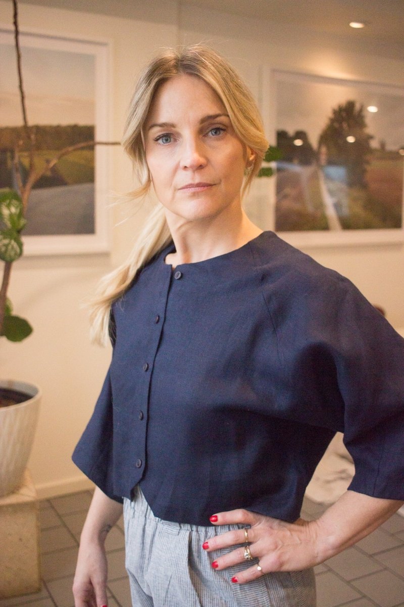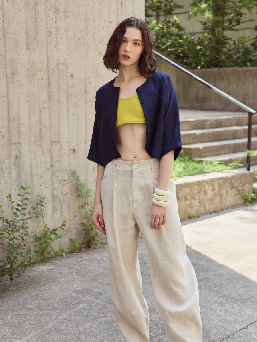A versatile essential, perfect for going through the mid-season in style! The Jaclyn Jacket by Eve Gravel is a cropped lightweight jacket with 3/4 sleeves and a round neck, made from a thick quality linen that offers a structured fit while still feeling light and comfortable to wear. It closes with cute matching buttons on the front and features a slight triangle cut out at the front of the hem.