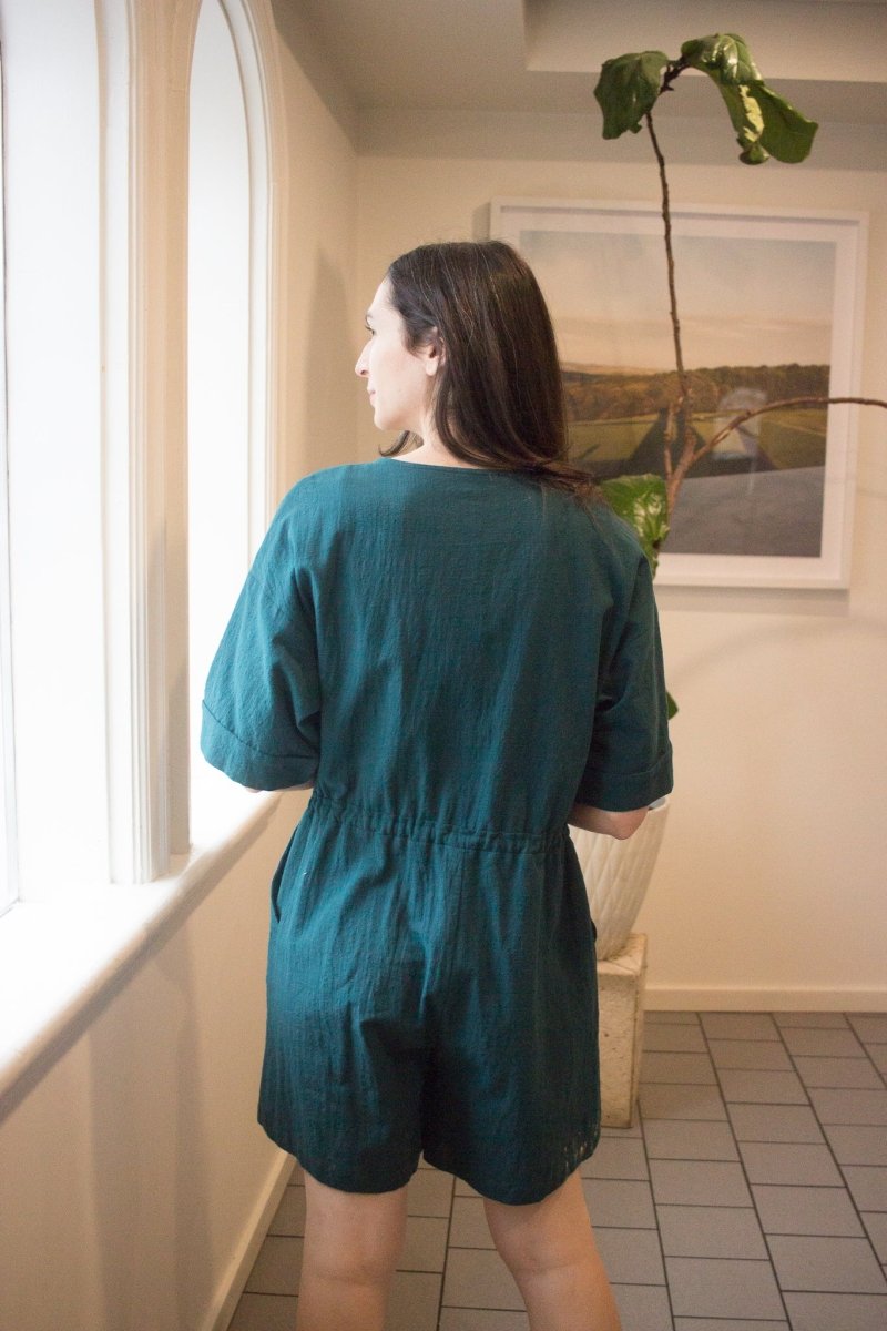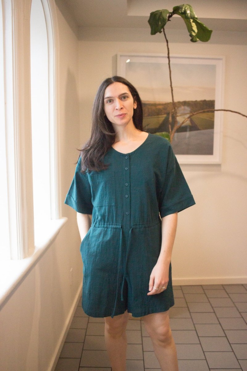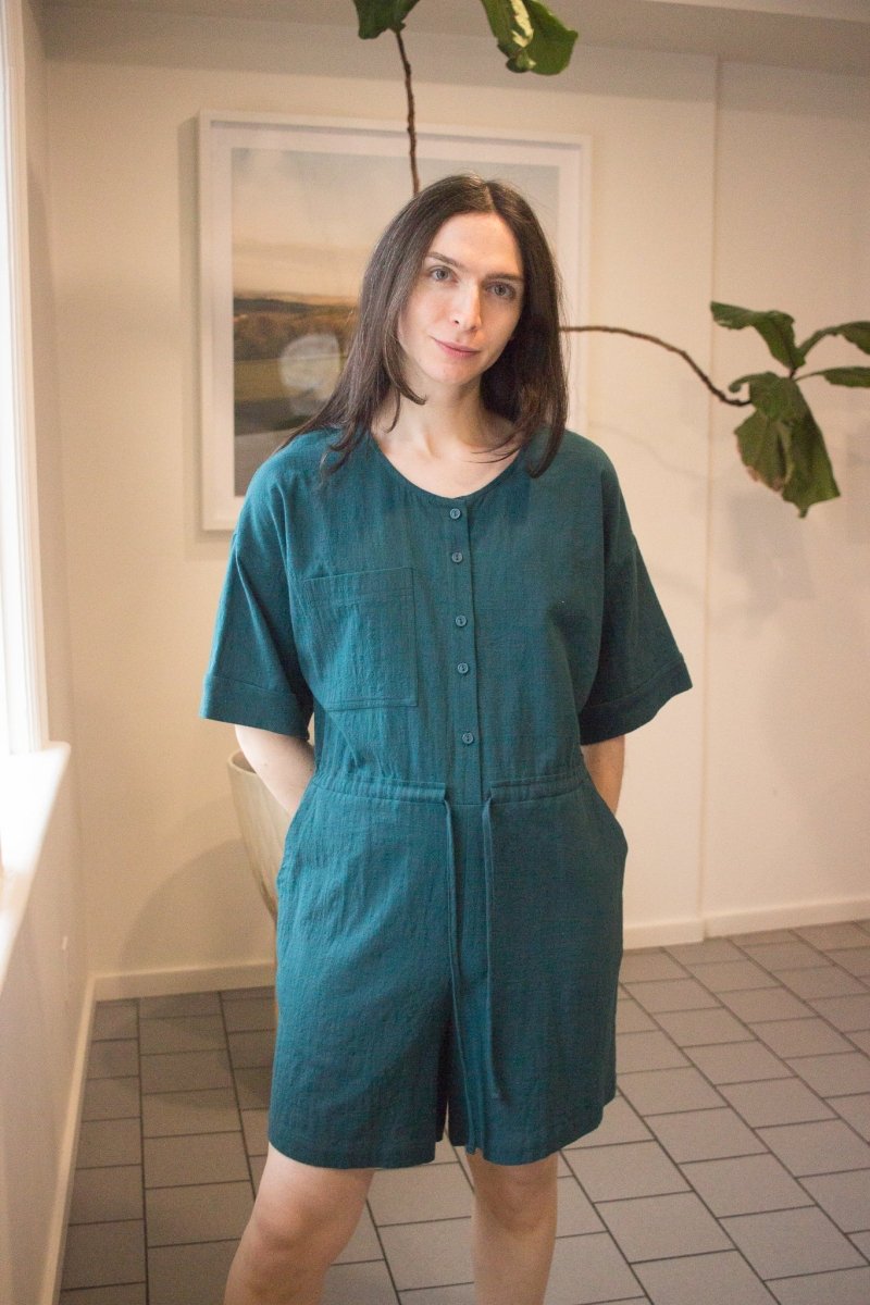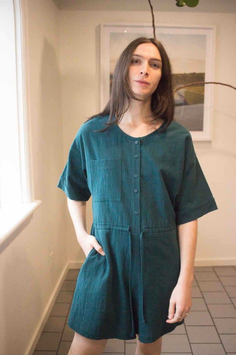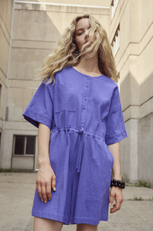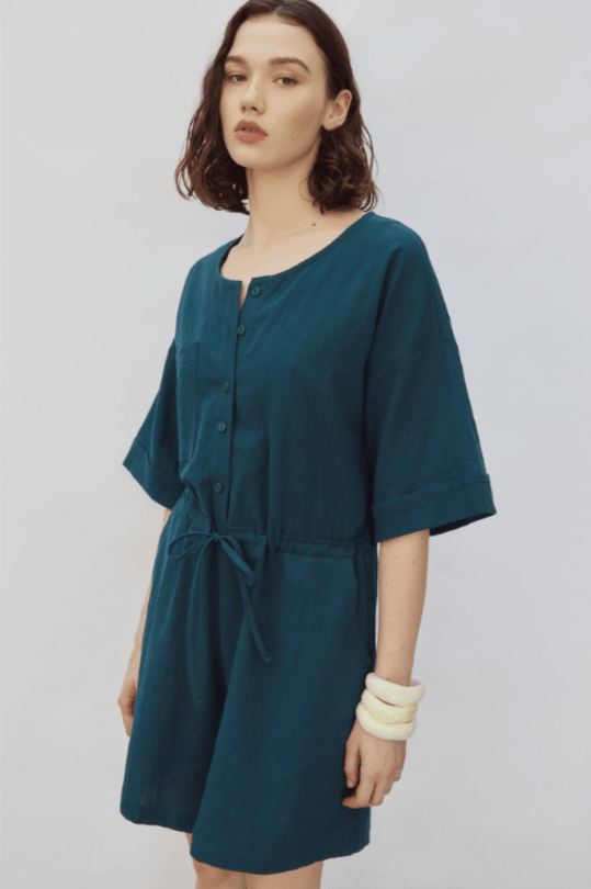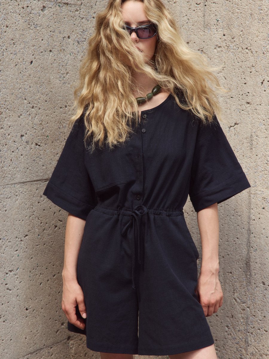 The Ted Jumpsuit is a crew-neck short jumpsuit, featuring an elegant front buttonhole, two side pockets and a drawstring at the waist for a custom fit. We love its generous, elbow-length sleeve, subtly finished with a cuff. Made of a slub cotton, its lightweight and textured material guarantees optimal comfort throughout the day!