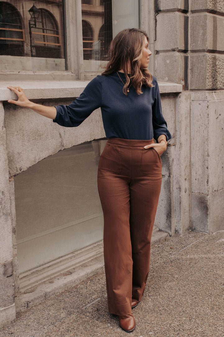 Meemoza's Warhol Pants are a wide cut, high waisted pant with deep pockets, featuring an elastic waistband at the back for extra comfort. The 70s-inspired silhouette feels timeless and pairs perfectly with the warm hue of the brown denim.