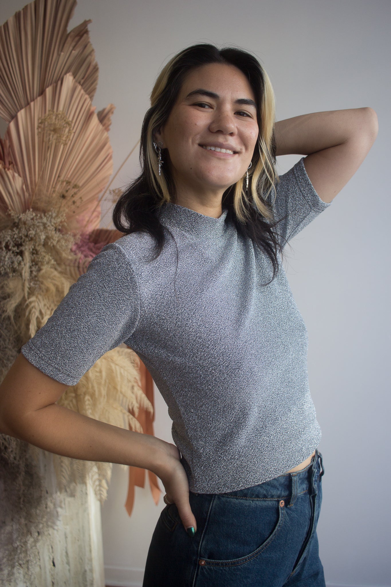 Mercedes Morin's Glitch top is a versatile statement piece crafted in a shimmery metallic fabric. This top features a mock neck and short sleeve, giving it an ease of wear that can be dressed up or down for any occasion. The metallic fabric adds dimension to this top that is sure to turn heads, while the smooth interior ensures you stay comfortable in it with every wear!