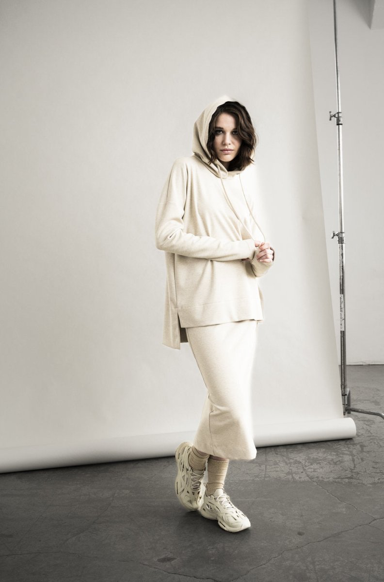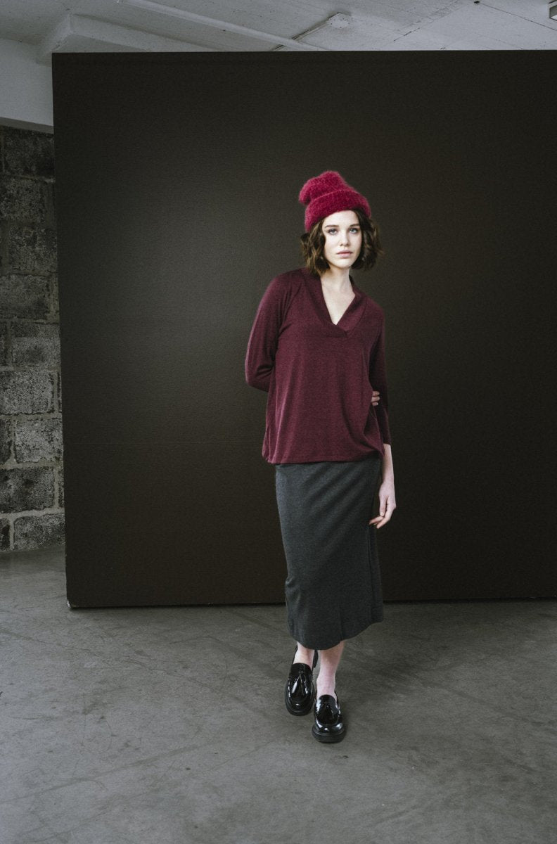 The Skye Skirt by Bodybag by Jude is soft heavy knit pencil skirt featuring a modest slit at the back and a covered waistband. The fabric is incredibly soft and gently hugs the body without being constricting. The Skye Skirts is mid calf length and the slit in the back allows for ease of wear while walking. Pair with a turtleneck or pull over sweater for an elegant and timeless outfit.