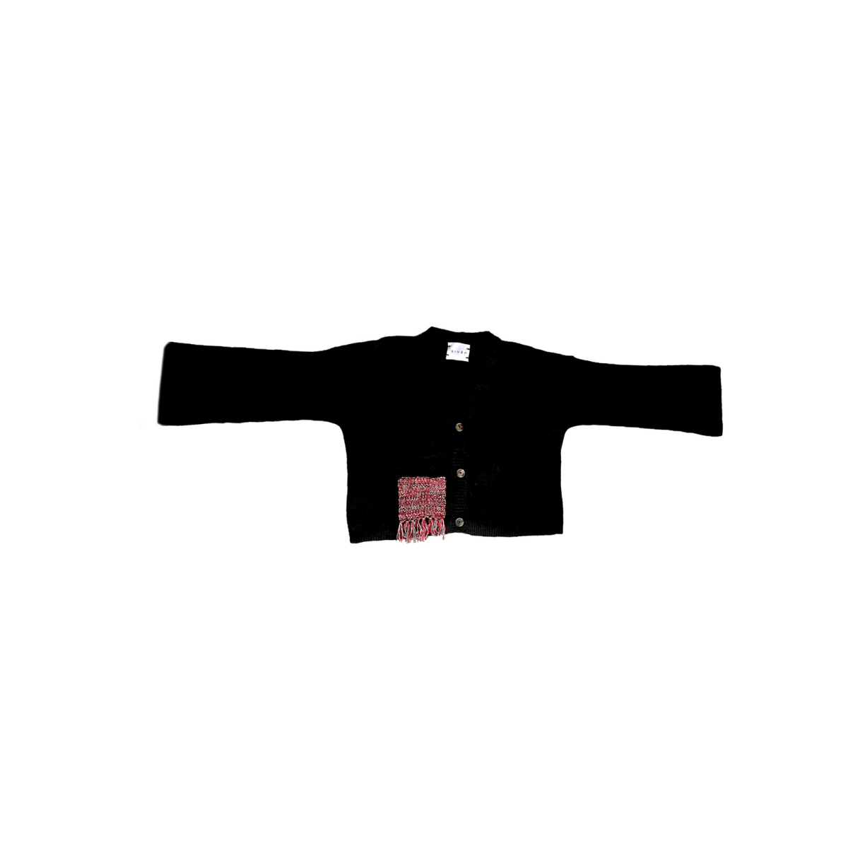 Elevate your layering game with the Melo Cardigan by Giveh! This statement V-neck cardigan, crafted in classic black merino wool and accented by bold red gradient fringe pockets. Designed with wide, elongated sleeves for a relaxed yet refined silhouette, this piece combines comfort with standout style.