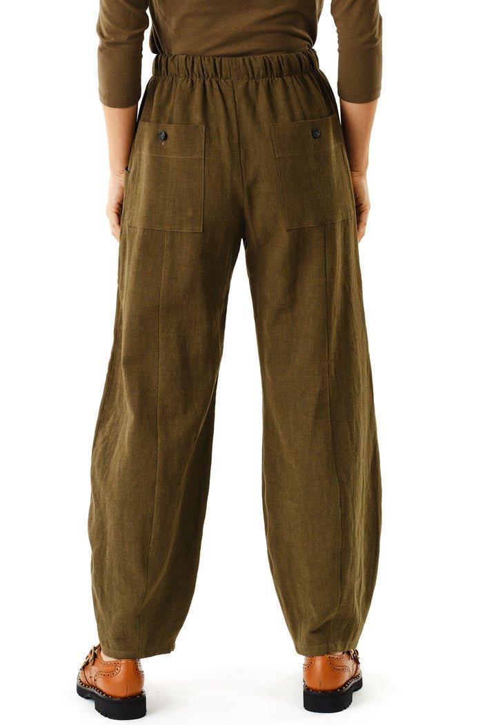 The Dorset Pants by Jennifer Glasgow are a voluminous casual pant made from a beautiful cotton Ramie. The textured fabric gives a wonderful look that can be dressed up or down. The drawstring and elastic waistband make them extra comfortable. There are integrated pockets in the front panel and pockets in the back with recycled paper buttons.