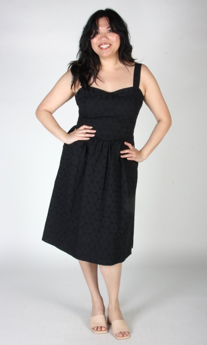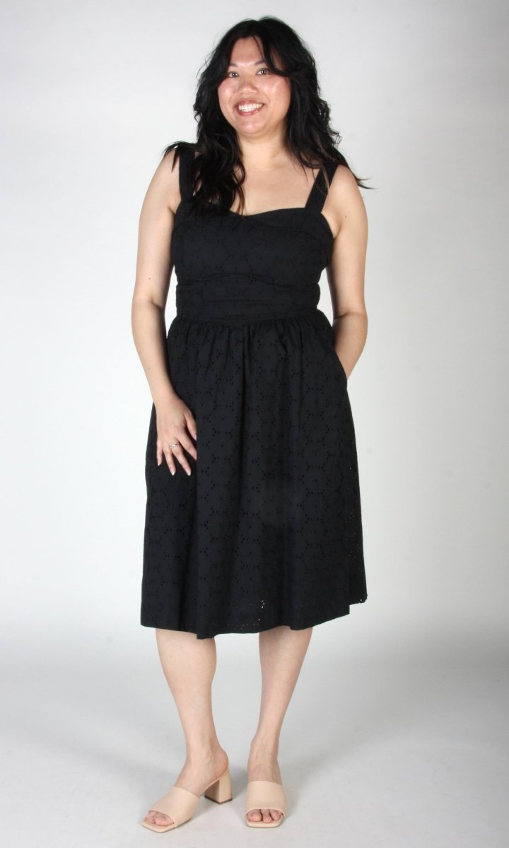 The Diablotin may have a devilish moniker (another name for the Black-capped petrel!), but it is an angelically sweet summer sundress by Birds of North America! Made of beautiful 100% cotton eyelet, this lovely frock has a sweetheart neckline with fold-over flaps at the bust. The yoked waist drops to a point at front and back, where it joins a gathered skirt. There are pockets at the sides, and it closes with a back invisible zipper.