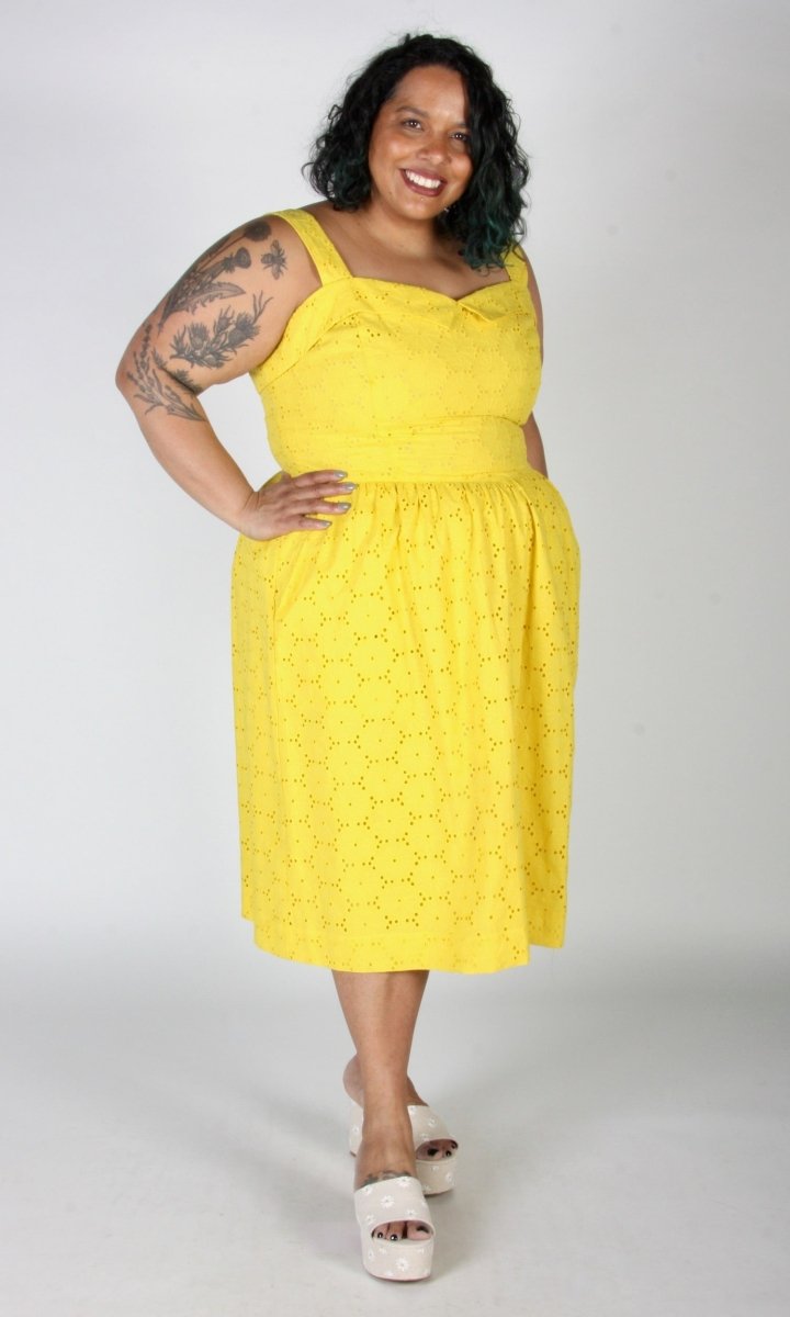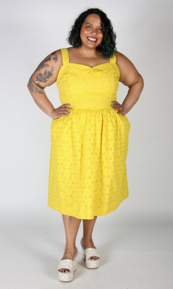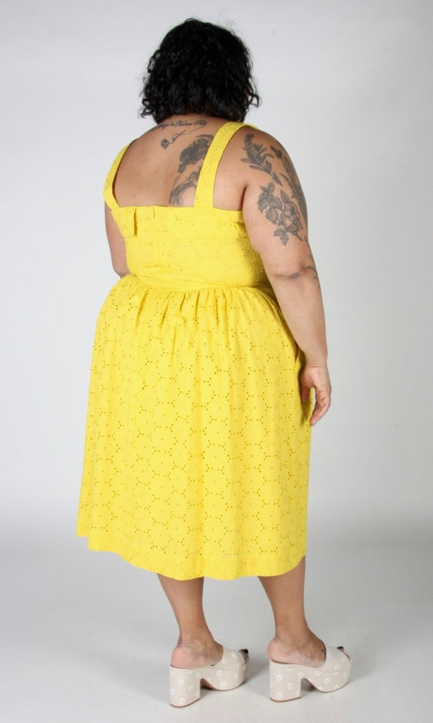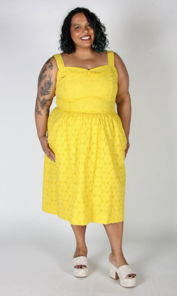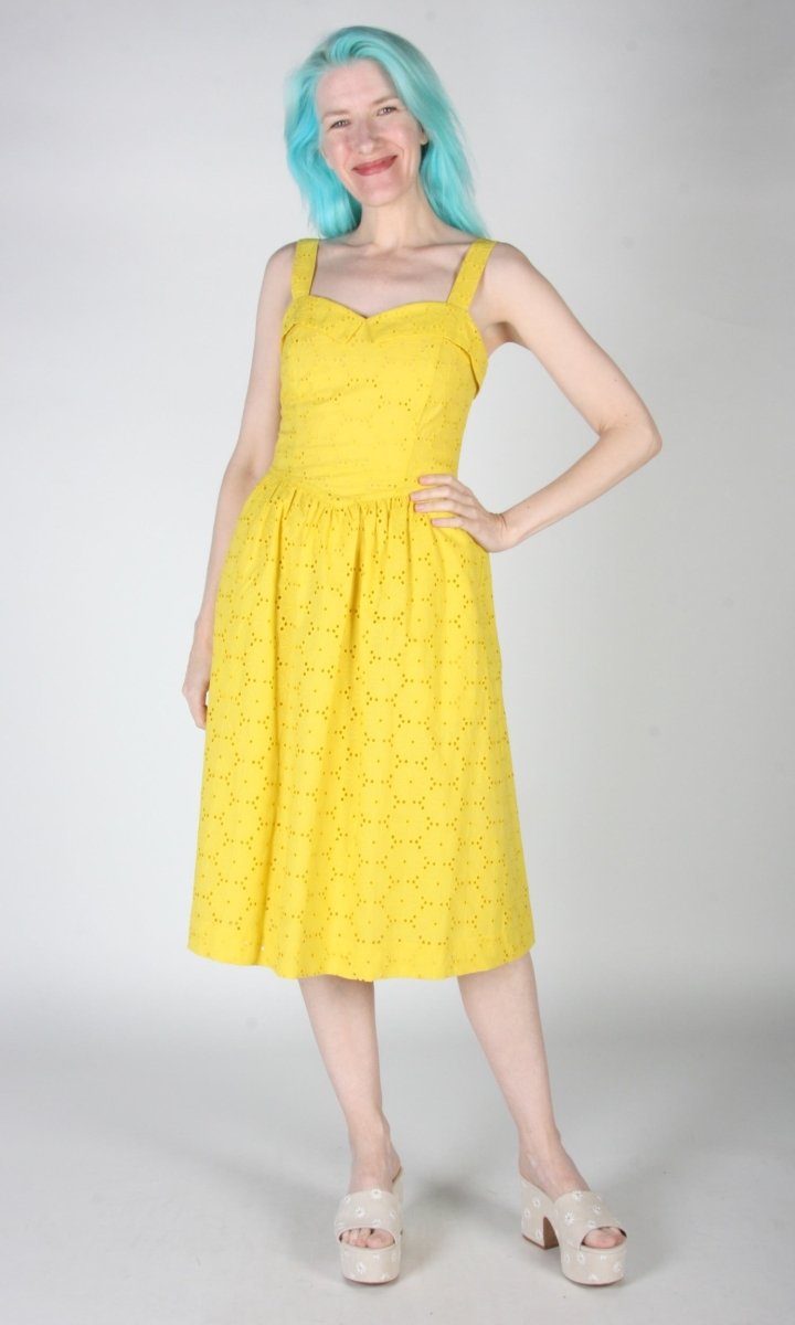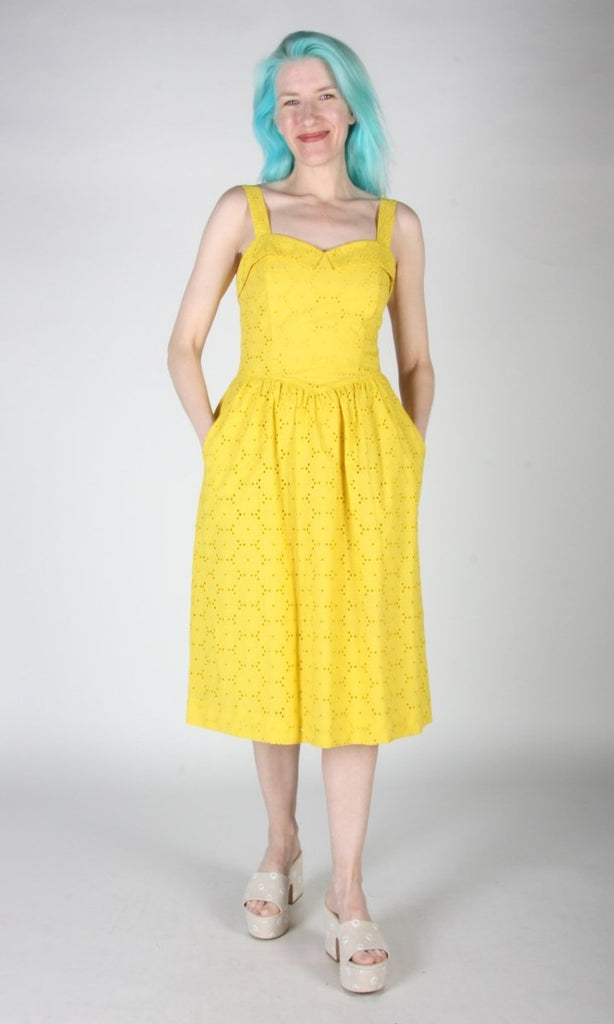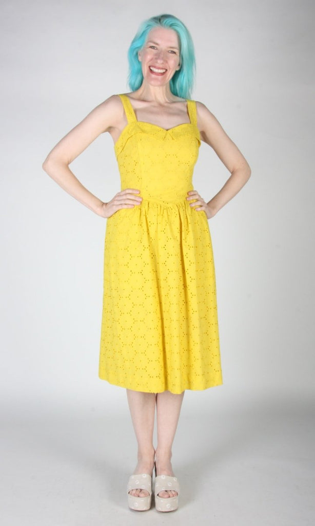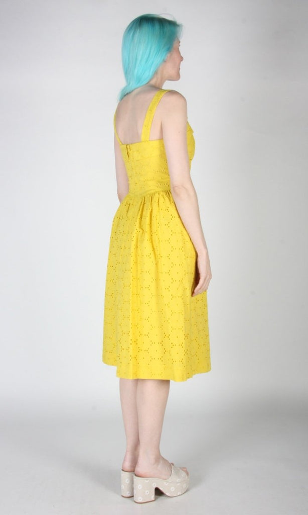 The Diablotin may have a devilish moniker (another name for the Black-capped petrel!), but it is an angelically sweet summer sundress by Birds of North America! Made of beautiful 100% cotton eyelet, this lovely frock has a sweetheart neckline with fold-over flaps at the bust. The yoked waist drops to a point at front and back, where it joins a gathered skirt. There are pockets at the sides, and it closes with a back invisible zipper.