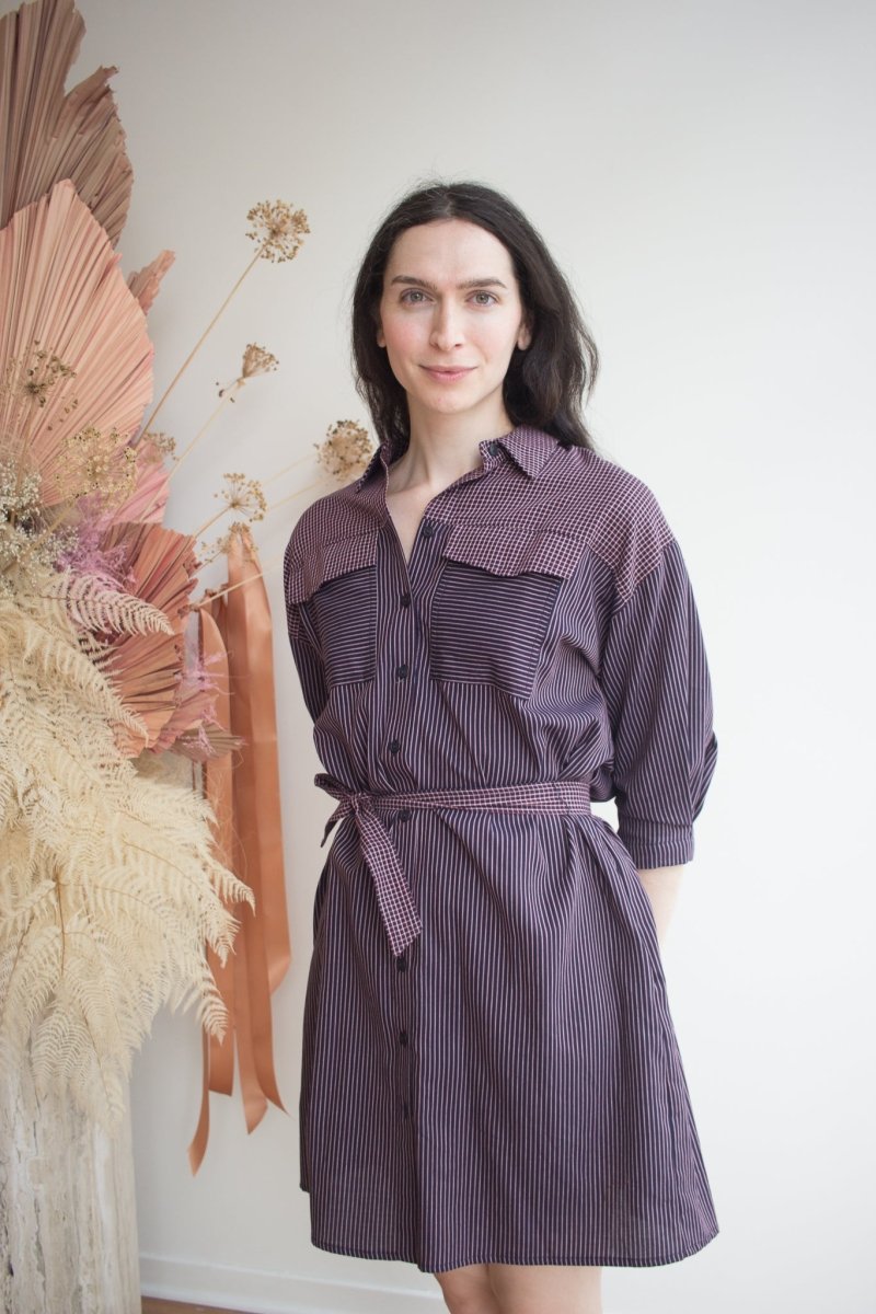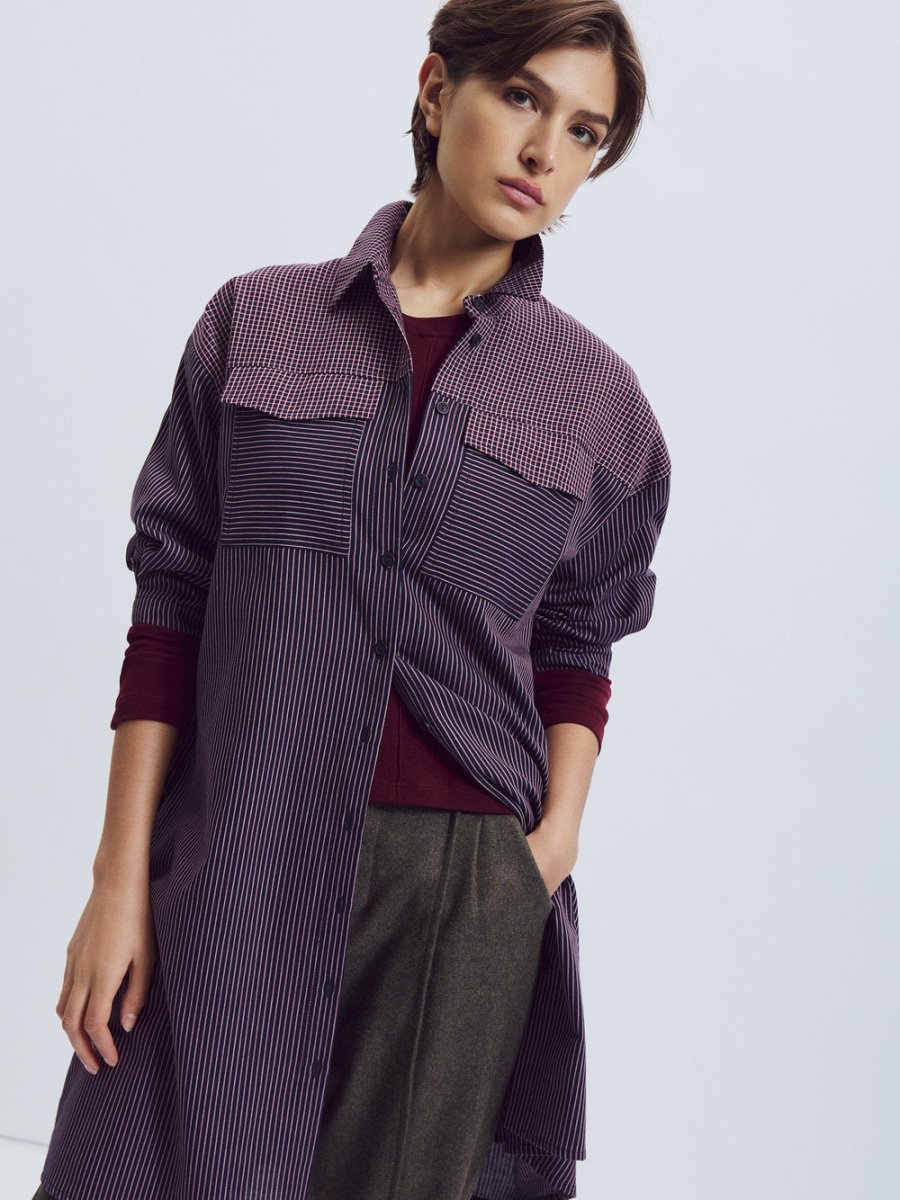 A versatile shirt dress, perfect for all seasons. Wear it open as a jacket or buttoned up with its belt for a more structured look. Featuring two practical side pockets and two front pockets, it combines comfort and functionality. The blend of stripes and checks adds a dynamic, vibrant touch, making this piece both stylish and easy to pair.