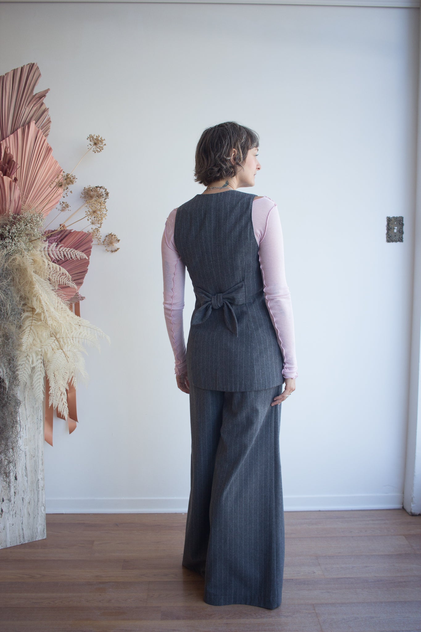 The Juliette Vest is a modern take on a classic suiting jacket. Featuring an adjustable tie at the back of the waist offering a different silhouette and styling options. The Juliette stands beautifully on it's own, but truly shines when paired with the matching grey pinstripe Lavoys cut from the same fabric. Pair them together for an elevated androgynous fit.