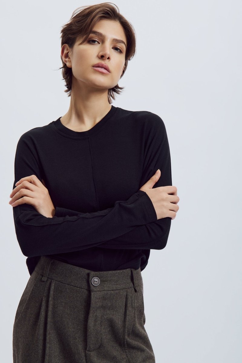 Eve Gravel has perfected the elevated basic with the Kapes Top. Featuring a round neckline, long sleeves, and a slightly loose fit for optimal comfort. Its ribbed details down the front and on the tops of the sleeves add a subtle yet refined touch. Made from a blend of wool and lyocell, the fabric is incredibly soft, combining comfort with exceptional quality. All crafted in Pealess fabric for unmatched durability.