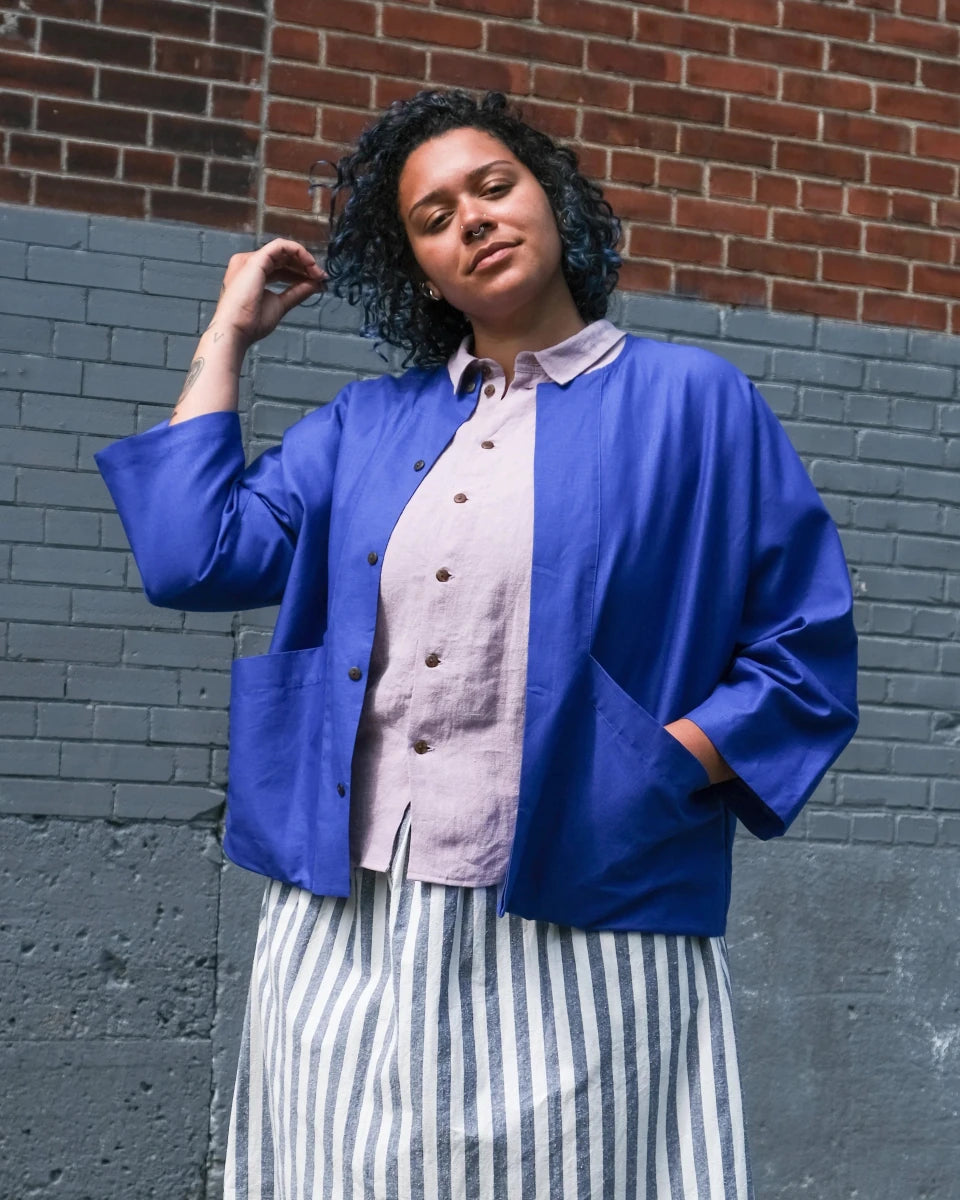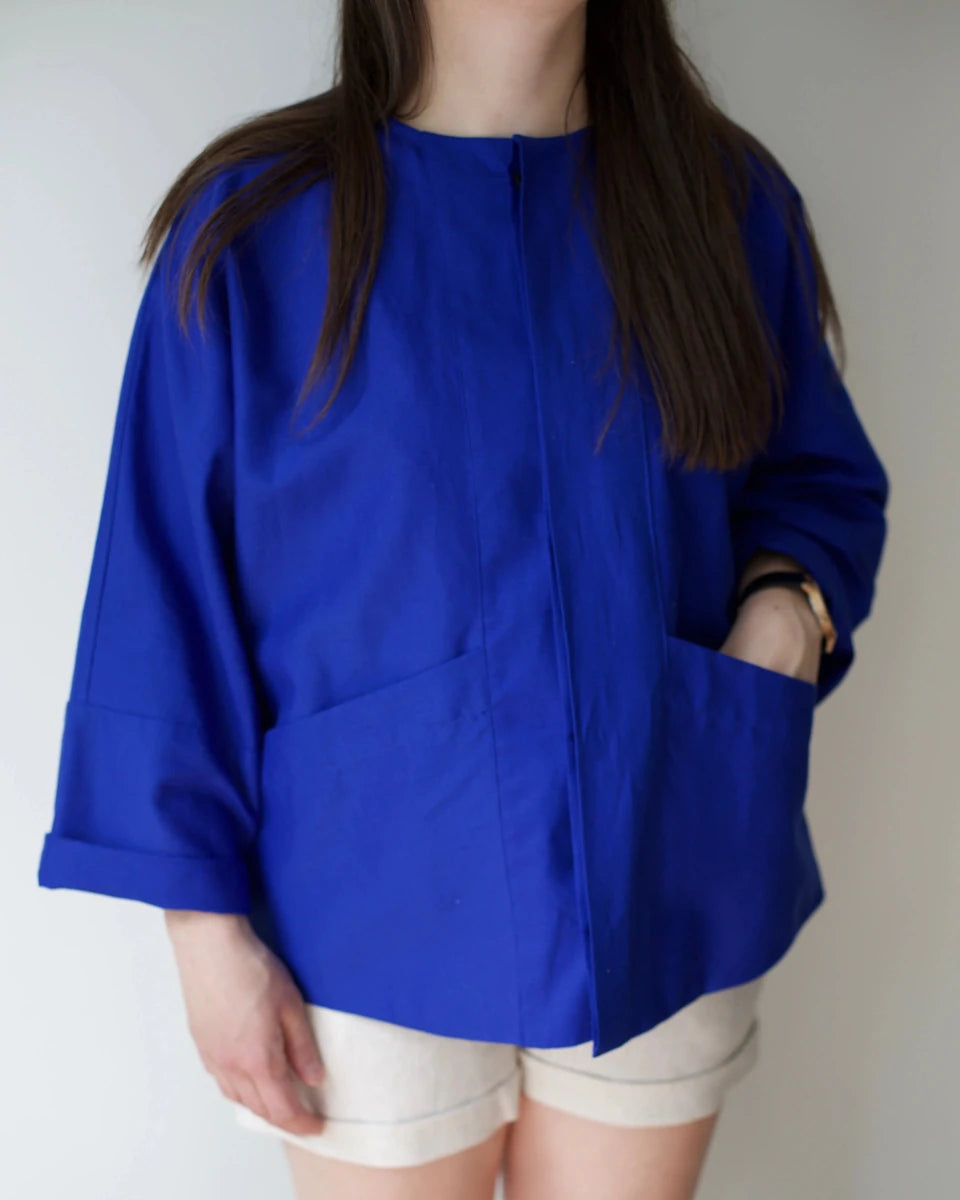 Atelier B's linen cotton vest is a design that's constantly evolving. It's one of Atelier B's classic cuts, with details and cut-outs that change from one season to the next. It has a large hidden buttonhole on the front, slanted pockets and long sleeves with a cut-out, tapering slightly towards the wrist. This version is made with a canvas made from linen and cotton in a saturated cobalt hue!