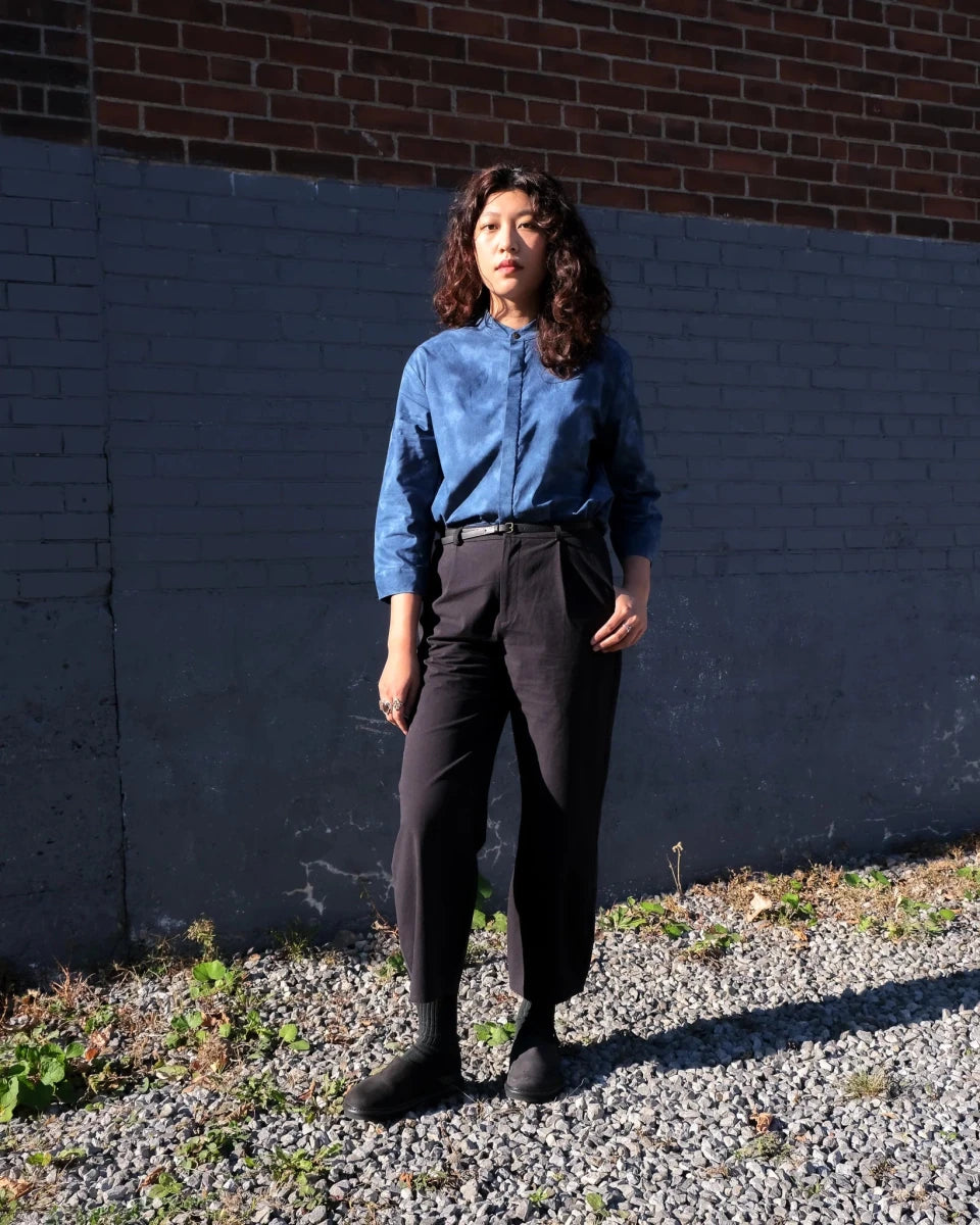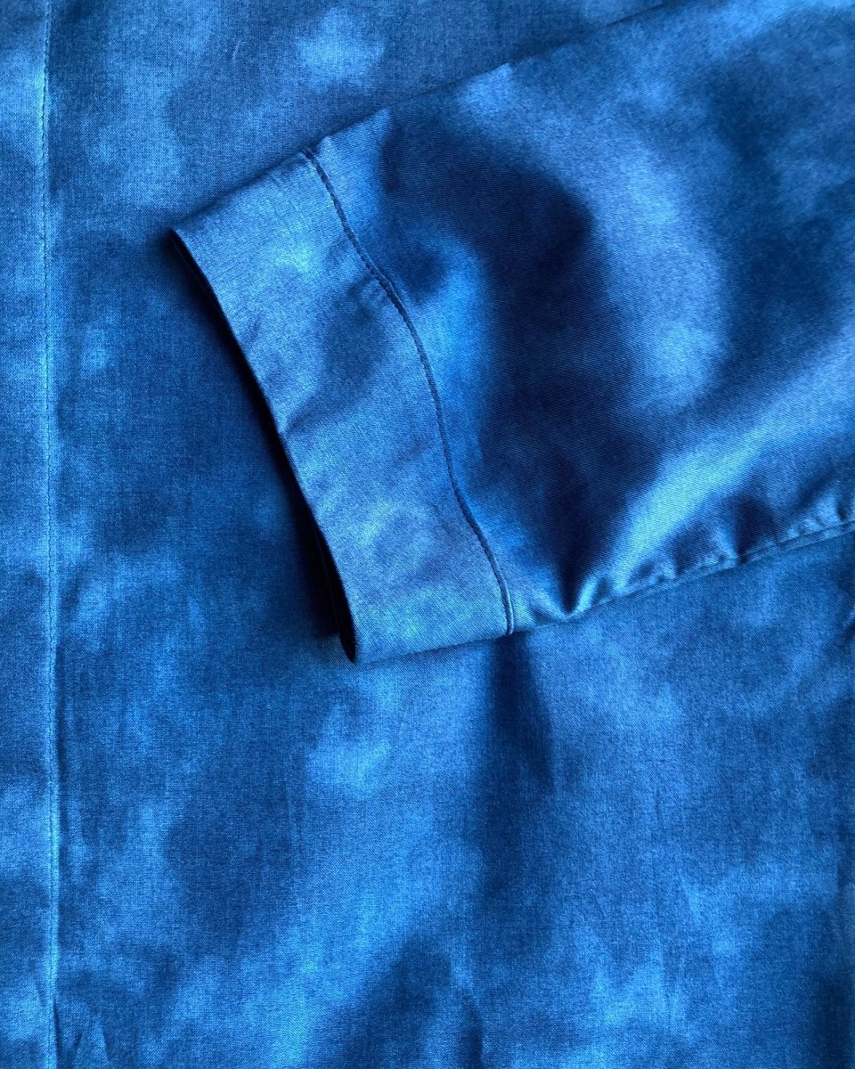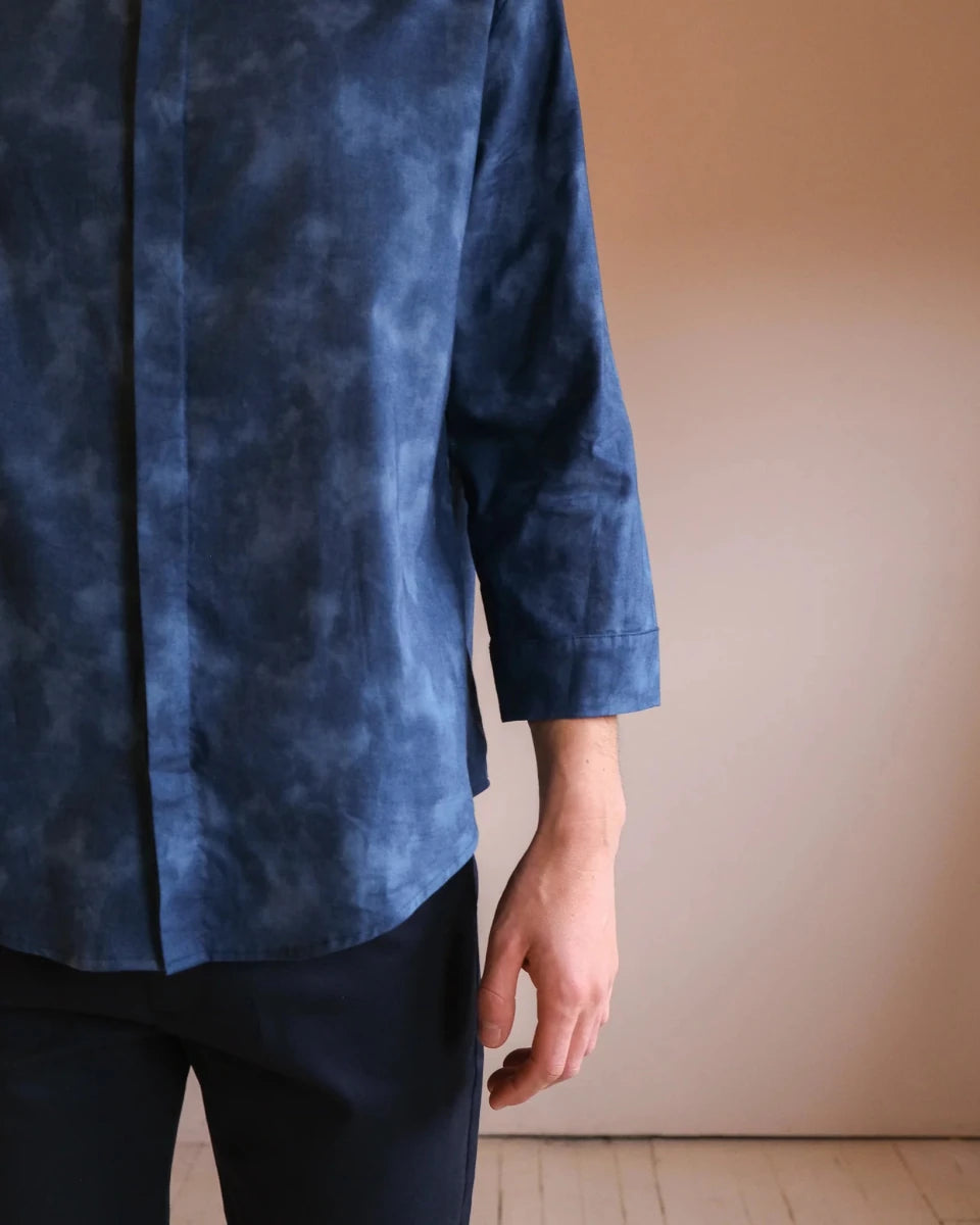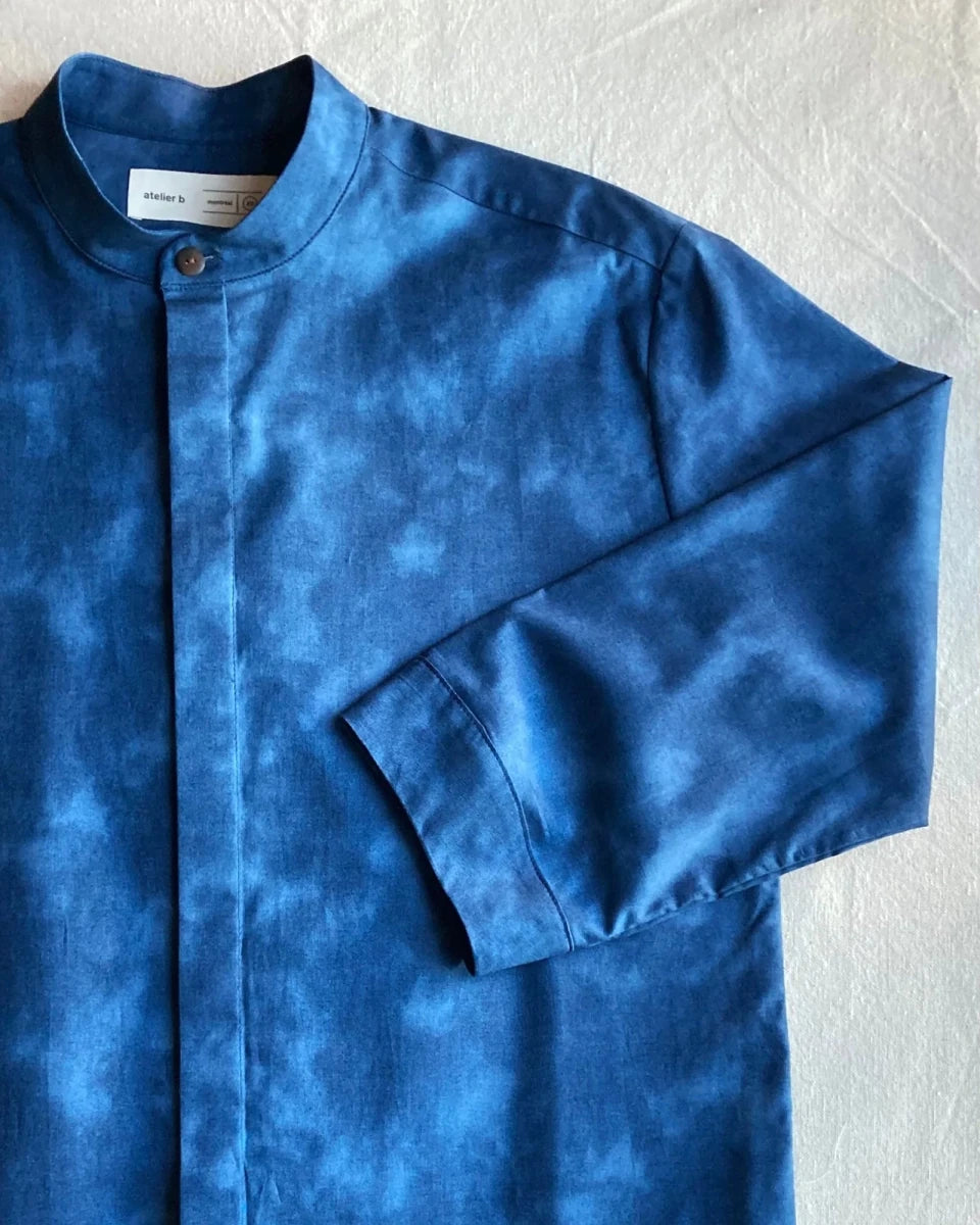 The Blue Shadows Unisex Shirt by Atelier B is 3/4 length sleeved shirt with a slighted rounded and wide hem, tortoise buttons with hidden button placket and officer collar.This fabric reminds us of the light through the foliage, creating shadows that pave nearby alleyways just as they do elsewhere, like in Japan.