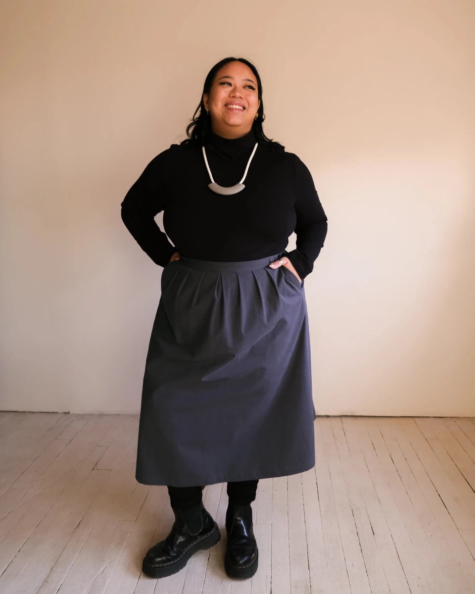 Atelier B's Wrap Skirt is wrap style skirt made with an organic heavyweight cotton. A durable material with a more structured drape. Featuring a wide belt with buttonholes that adjust at the front, pleats and darts at waist for a better fit and finished with slanted front pockets. This skirt has a slightly curved hem that reaches mid-calf.
