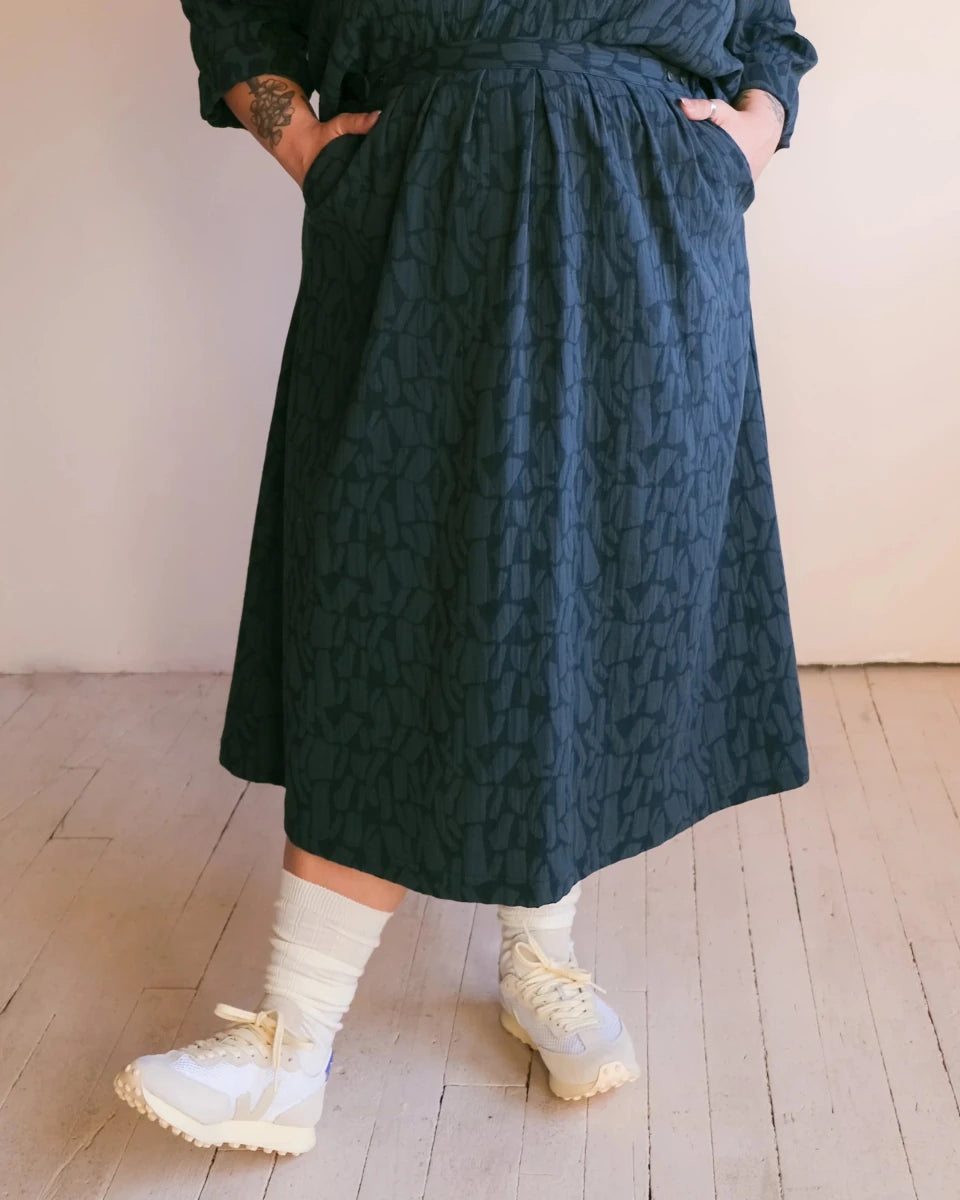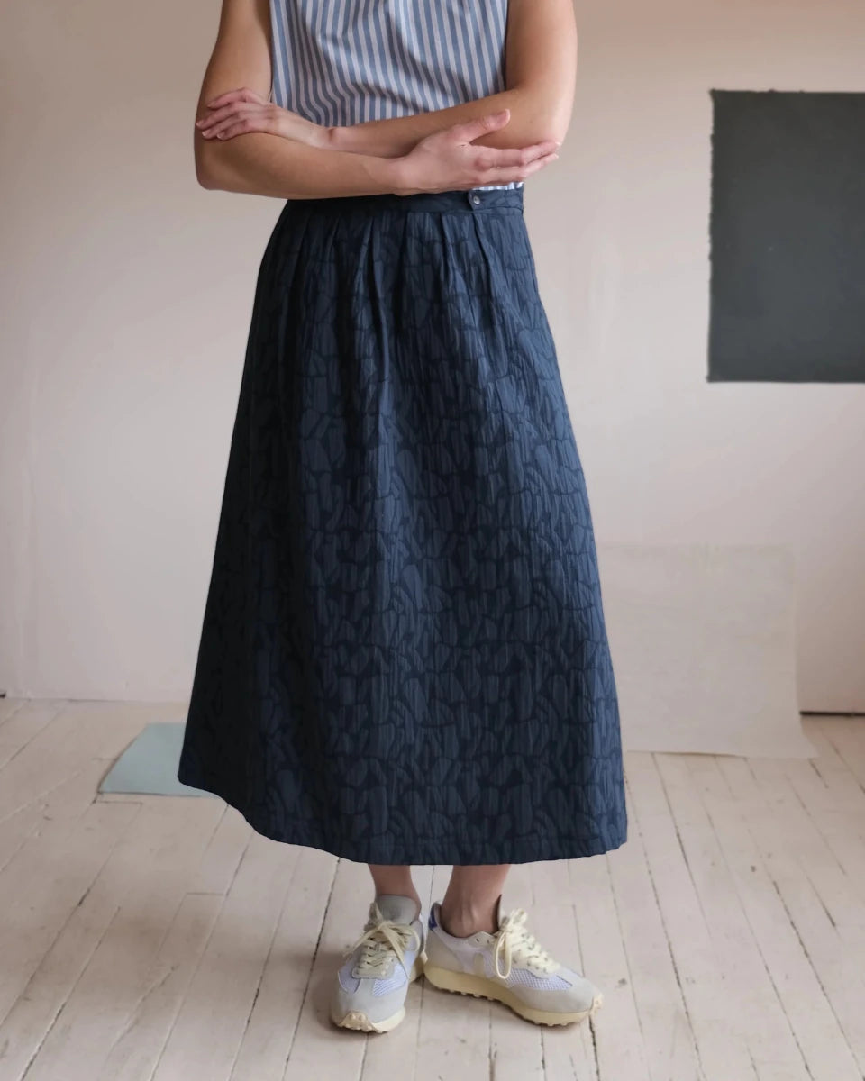 Atelier B's Wrap Skirt is wrap style skirt made with a woven jacquard with an organic tone-on-tone pattern. The patterns created by the weave structure add complexity to the garment while remaining neutral. Featuring a wide belt with buttonholes that adjust at the front, pleats and darts at waist for a better fit and finished with slanted front pockets. This skirt has a slightly curved hem that reaches mid-calf.