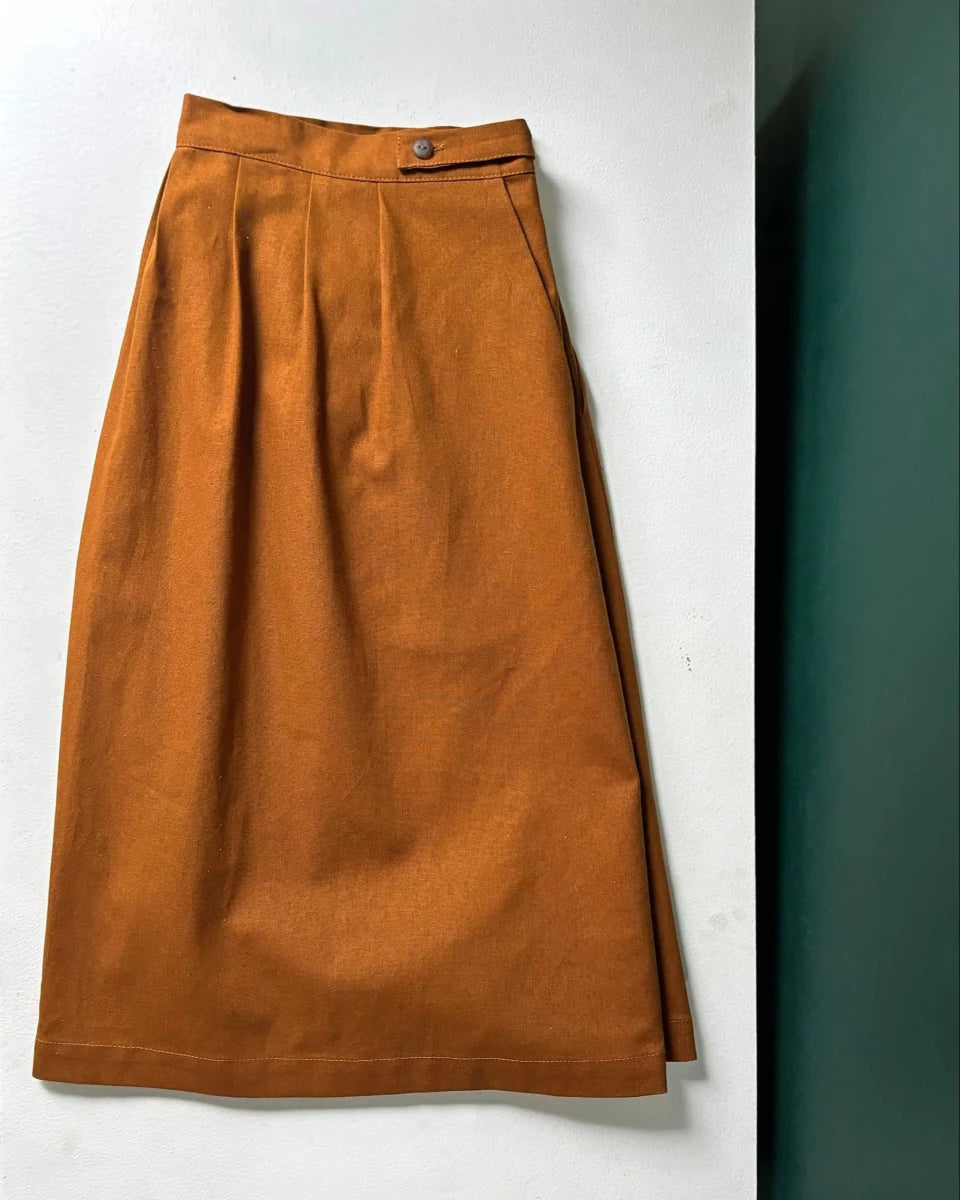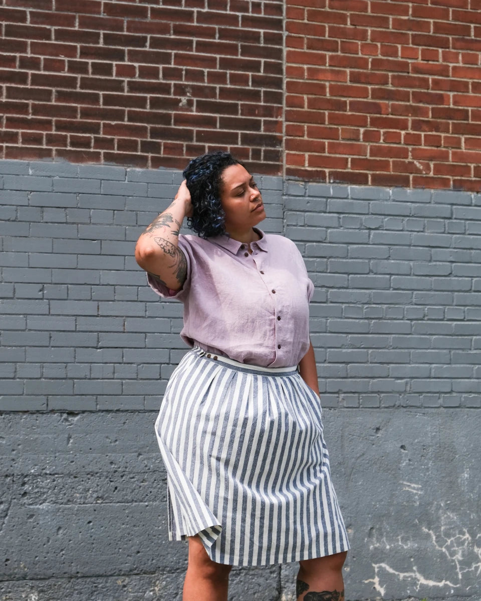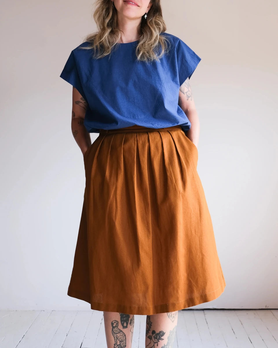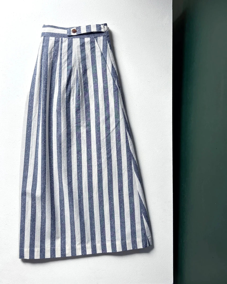 Atelier B's Wrap Skirt has a slightly flared cut. The waistband allows you to adjust the size using the buttons on the front. Featuring pleats and darts at waist, slanted front pockets and a straight hem that falls just below the knee. This wrap skirt was made with several different materials including a cobalt linen, which is light and colourful, a cotton and linen blend in copper, which has a structured and durable fabric and the final version that is made in a white and blue striped cotton and silk blend, the addition of silk makes this fabric slightly textured!