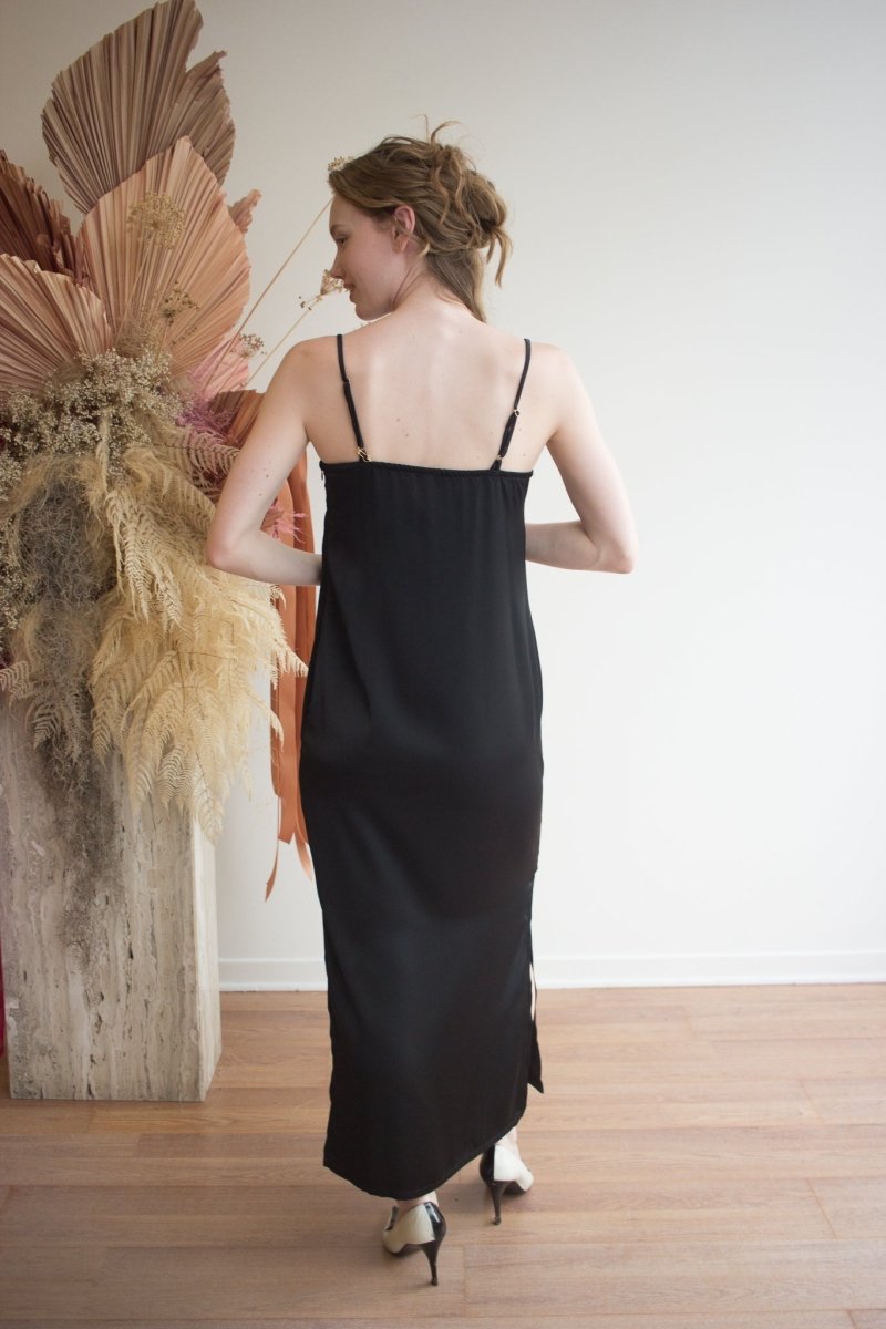 This sleek shift dress offers comfort and elegance. Thin adjustable straps ensure a personalized fit, while the invisible side zipper allows for easy entry. Side openings add a touch of femininity and movement. Crafted from a smooth, lightweight, and wrinkle-resistant polyester satin fabric with a beautiful sheen. Ideal for summer days or casual occasions, it pairs easily with sandals or heels for a versatile look.
