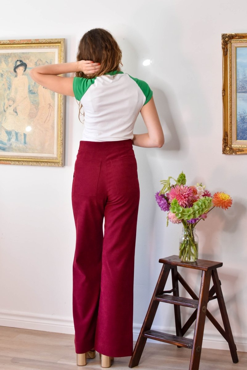It's time to boogie again! The Birds of North America's velvety Bloodfool Pants are BACK! These 70s-meets-90s flares have a high waist, fly front closure and button waist. We love the practical and big patch pockets on both the front and back. The velvet fabric has a stretch to it that will make these pants fitted on your booty before gliding down to the floor. These would be great for work with a neutral blouse or a fun night out with a tank top and platform boots.