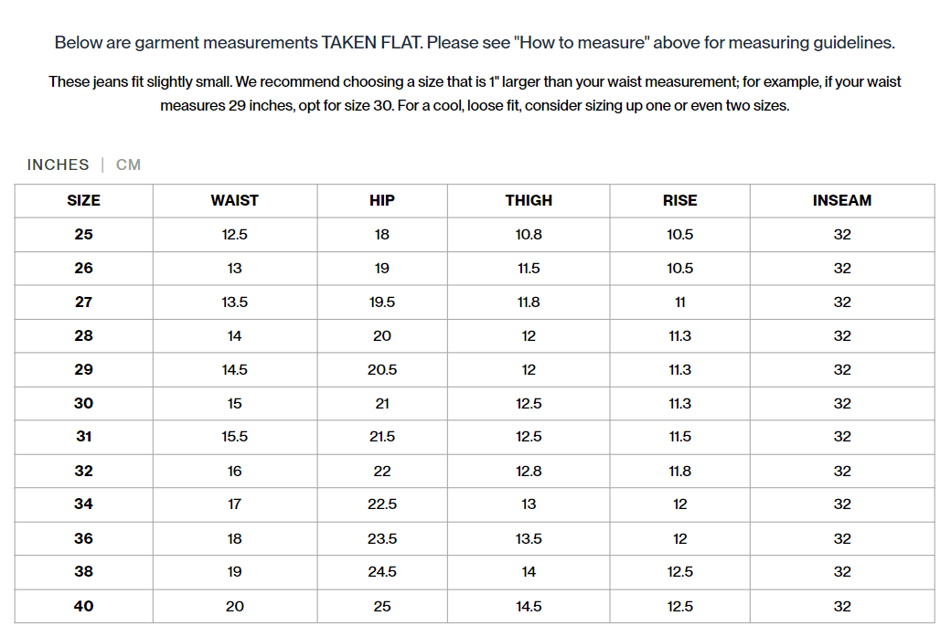Sizing Notes: These jeans fit slightly small. We recommend choosing a size that is 1" larger than your waist measurement; for example, if your waist measures 29 inches, opt for size 30. If you prefer a relaxed/less fitted look, consider sizing up 1 or 2 sizes!