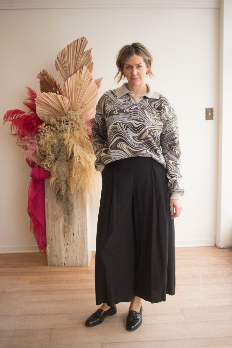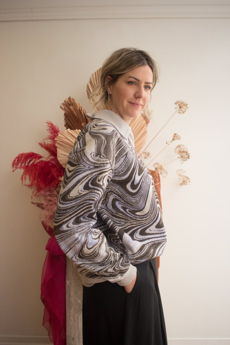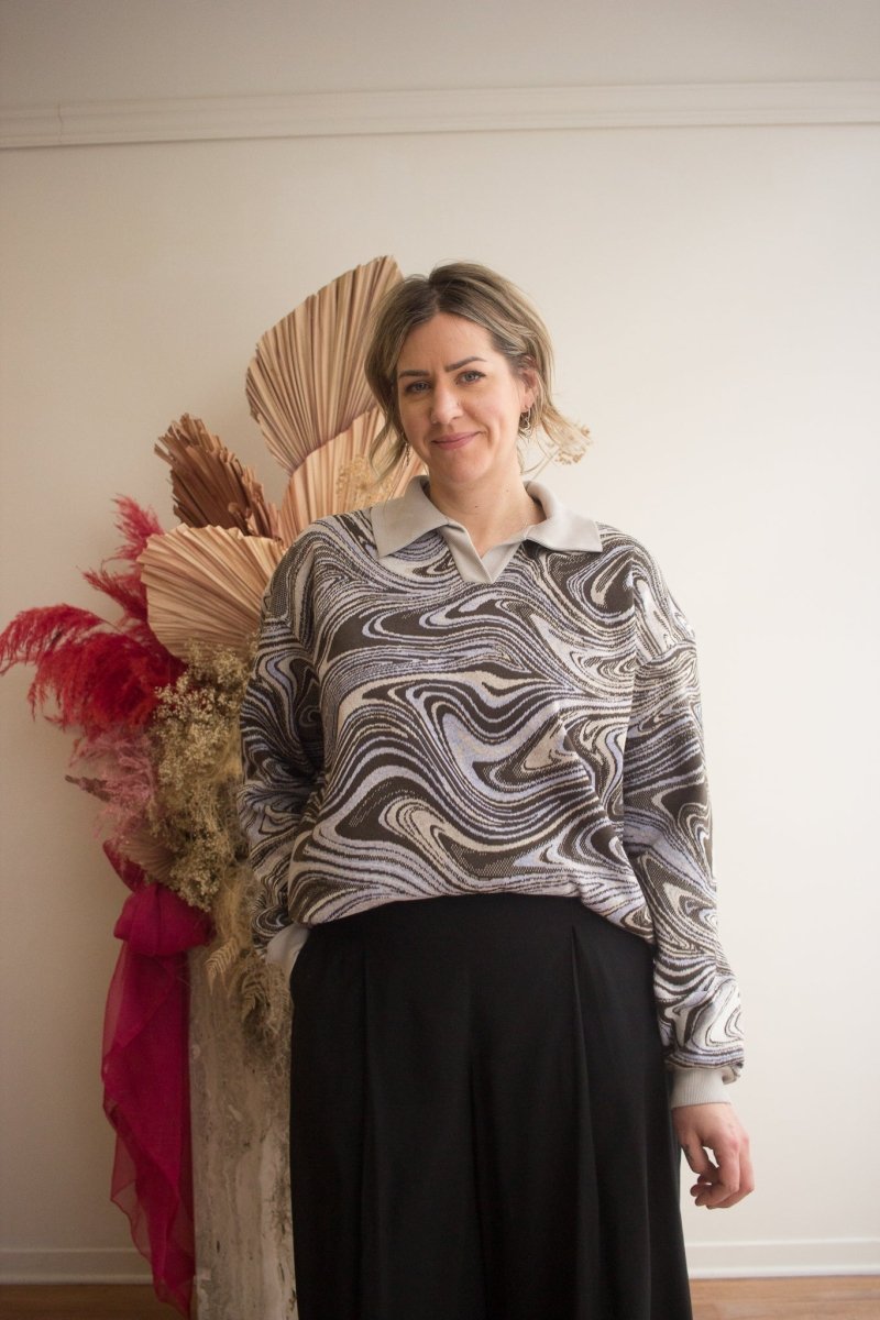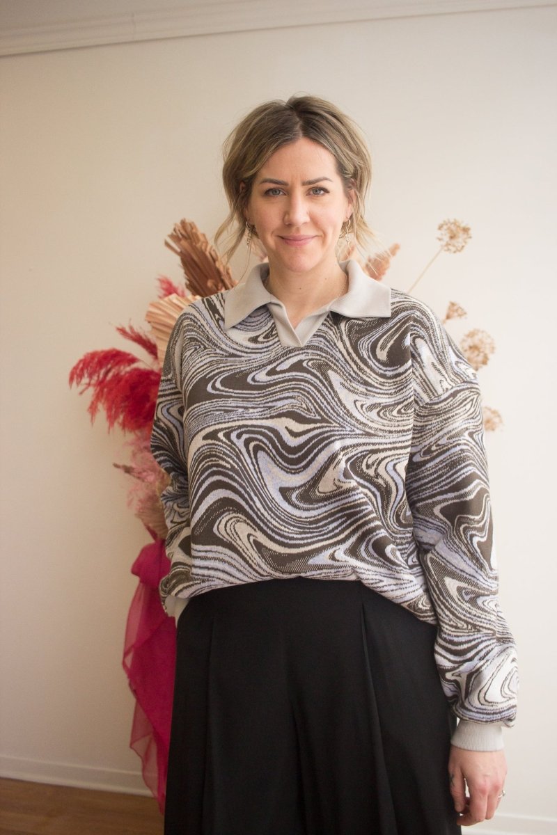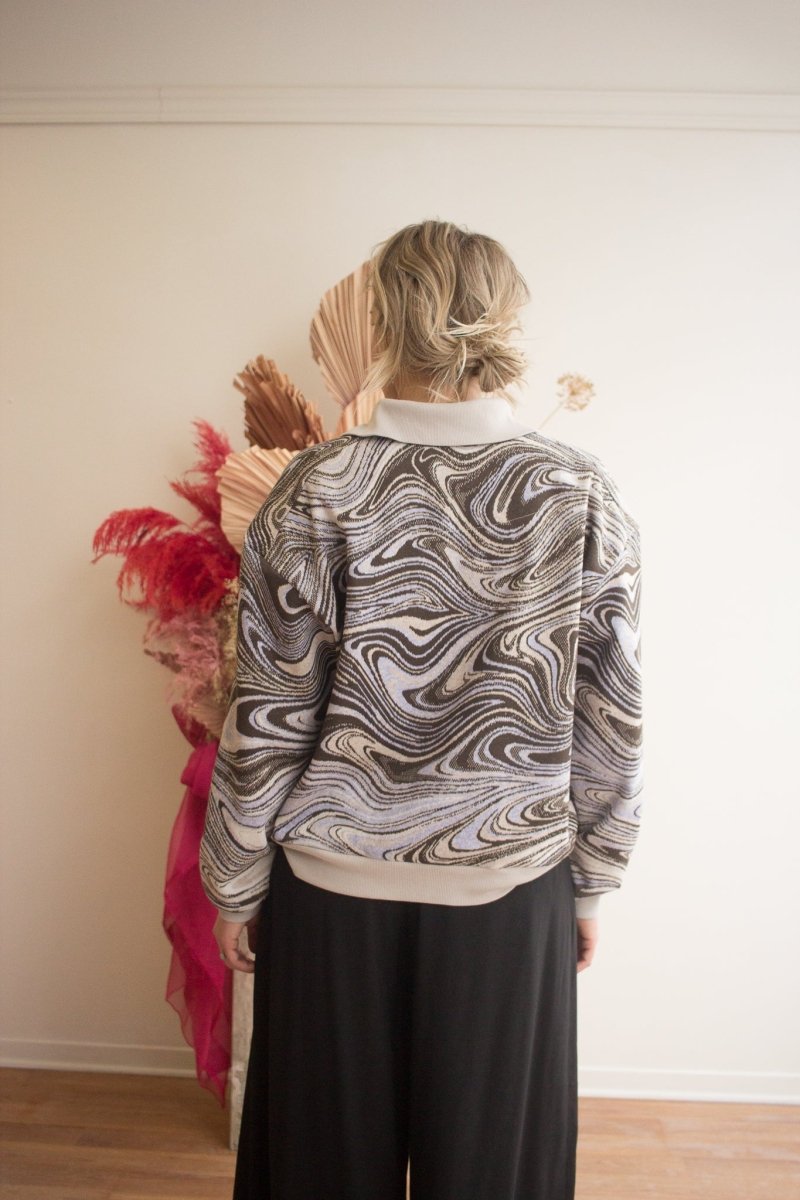 Add some razzle dazzle to your wardrobe with Veri's Swirl Sweatshirt! Crafted from a unique, hazy deadstock fabric found in Montréal’s fashion district, its boxy fit and relaxed Johnny collar make it effortlessly comfortable, and eye-catching. Perfect for spicing up any outfit, pair with any ol’ pair of denim or have fun with it, and mix it up with another motif!