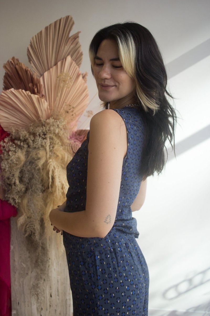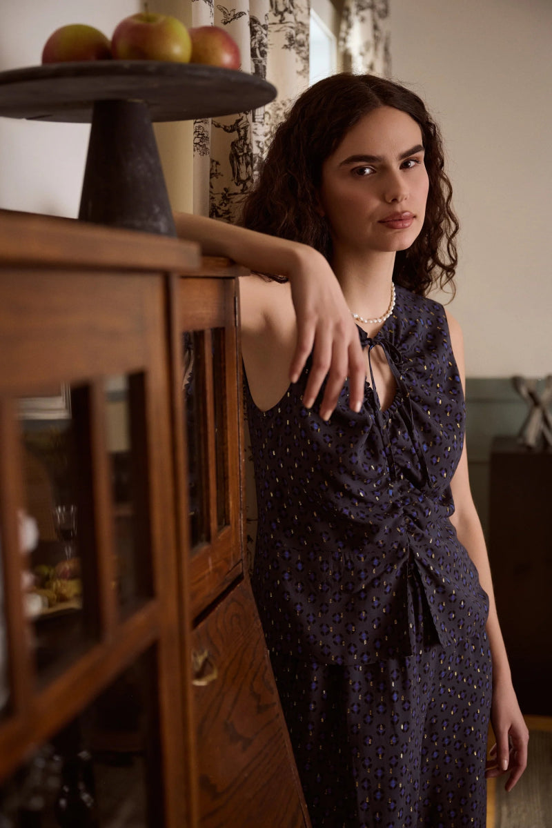 The Plumdesir Top by DorsaLi is a beautiful printed sleeveless top crafted from a luxurious French fabric. The Plumdesir is fully lined for maximum comfort and ease of wear. It features a front pull drawstring with an elasticized keyhole detail. Pair it with mid-rise baggy navy denim for a relaxed yet polished look or pair it with the matching Plumdesir Pants for a full set appropriate for parties, events, dates and beyond!