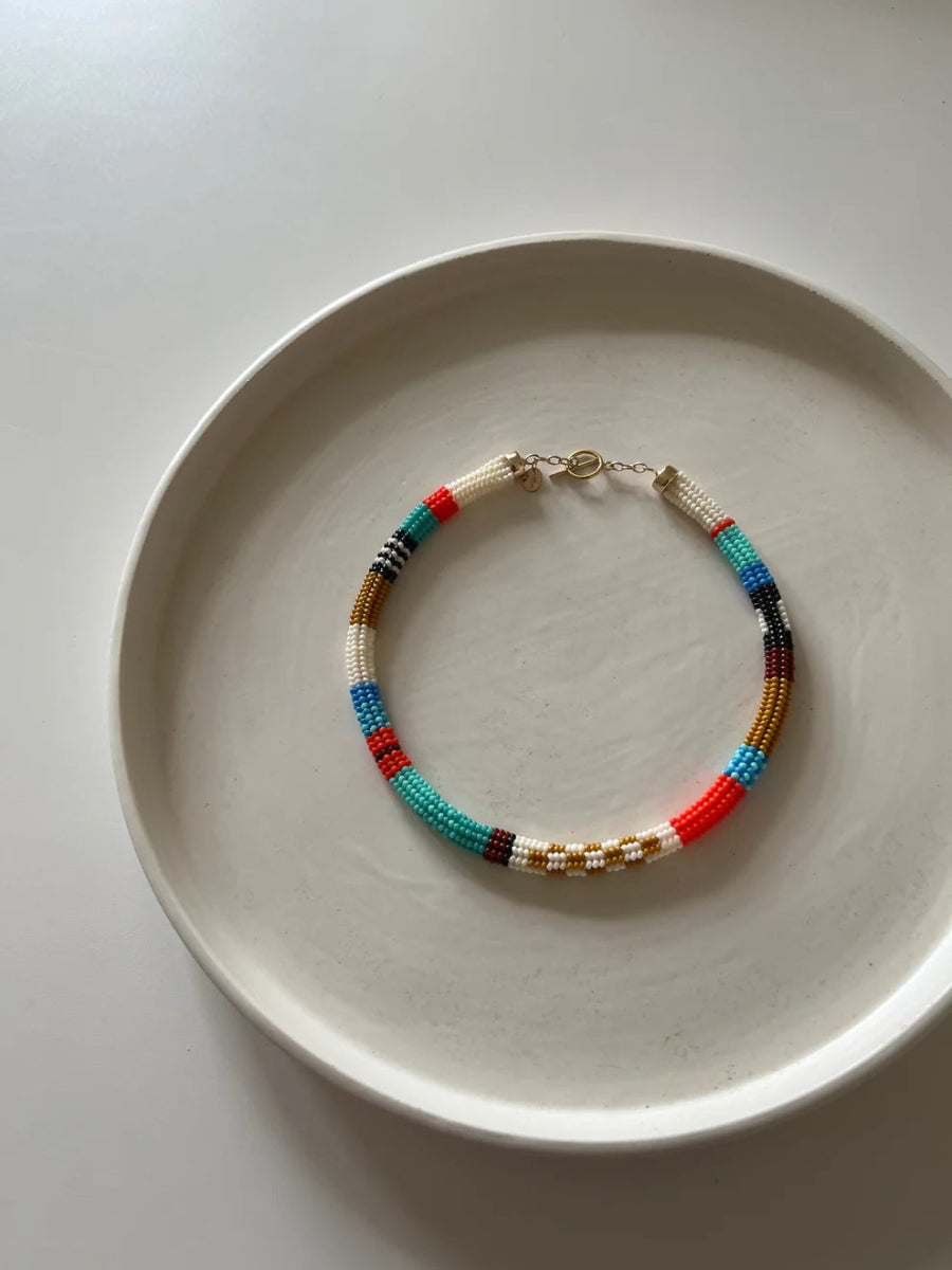 The Healey choker by Miiken is the boldest of colour palette of herchokers, with a south western influenced color way featuring splashes of mustard and sunset orange in a geometric pattern.