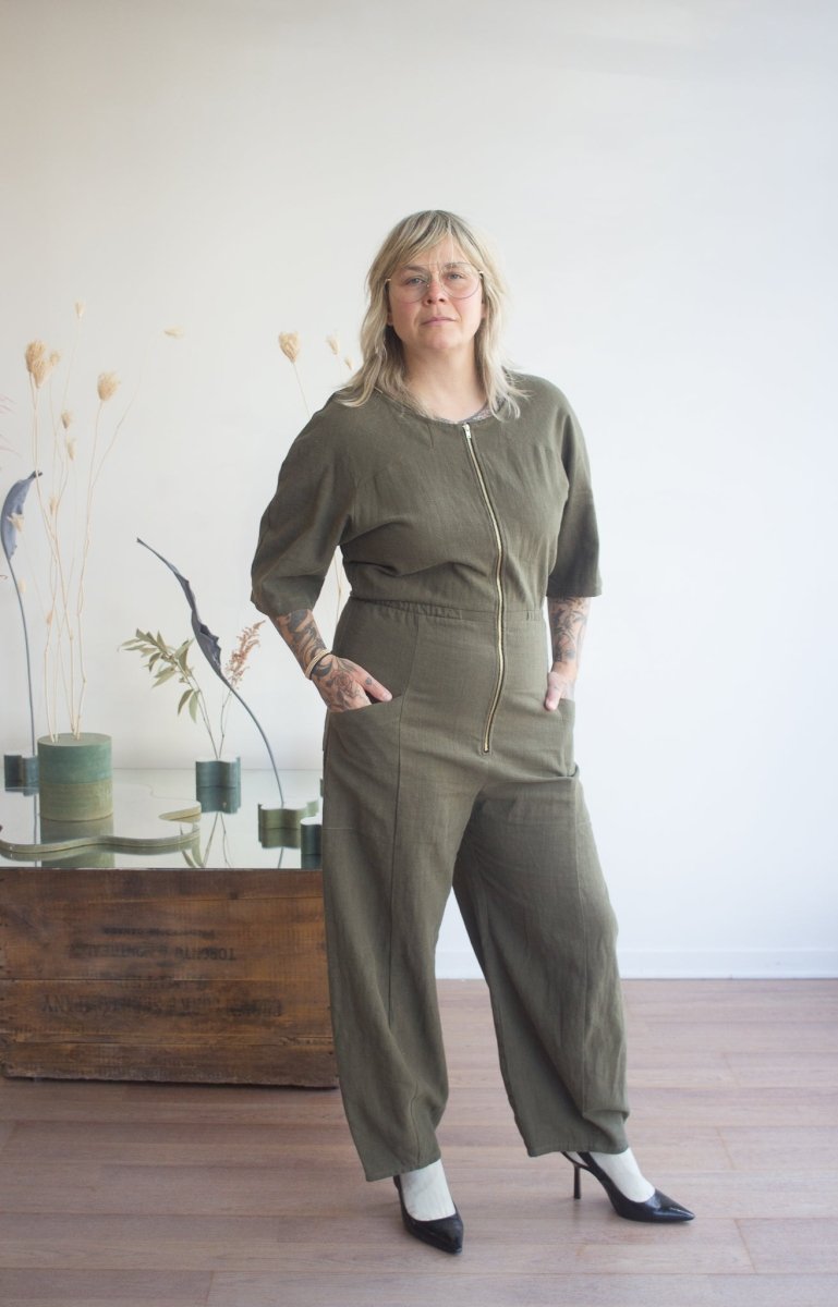 The Pegasus jumpsuit from Jennifer Glasgow is a playful take on a classic flight suit. The zipper front and relaxed fit make this an easy piece to get up and go about your day in comfort, while the elastic waist gives slight cinching which contrasts beautifully with sculptural shape of the batwing sleeve and balloon leg. This is sure to be a go-to piece when you're looking for a piece to throw-on-and-go in style
