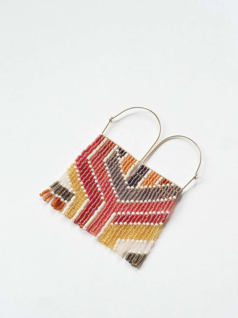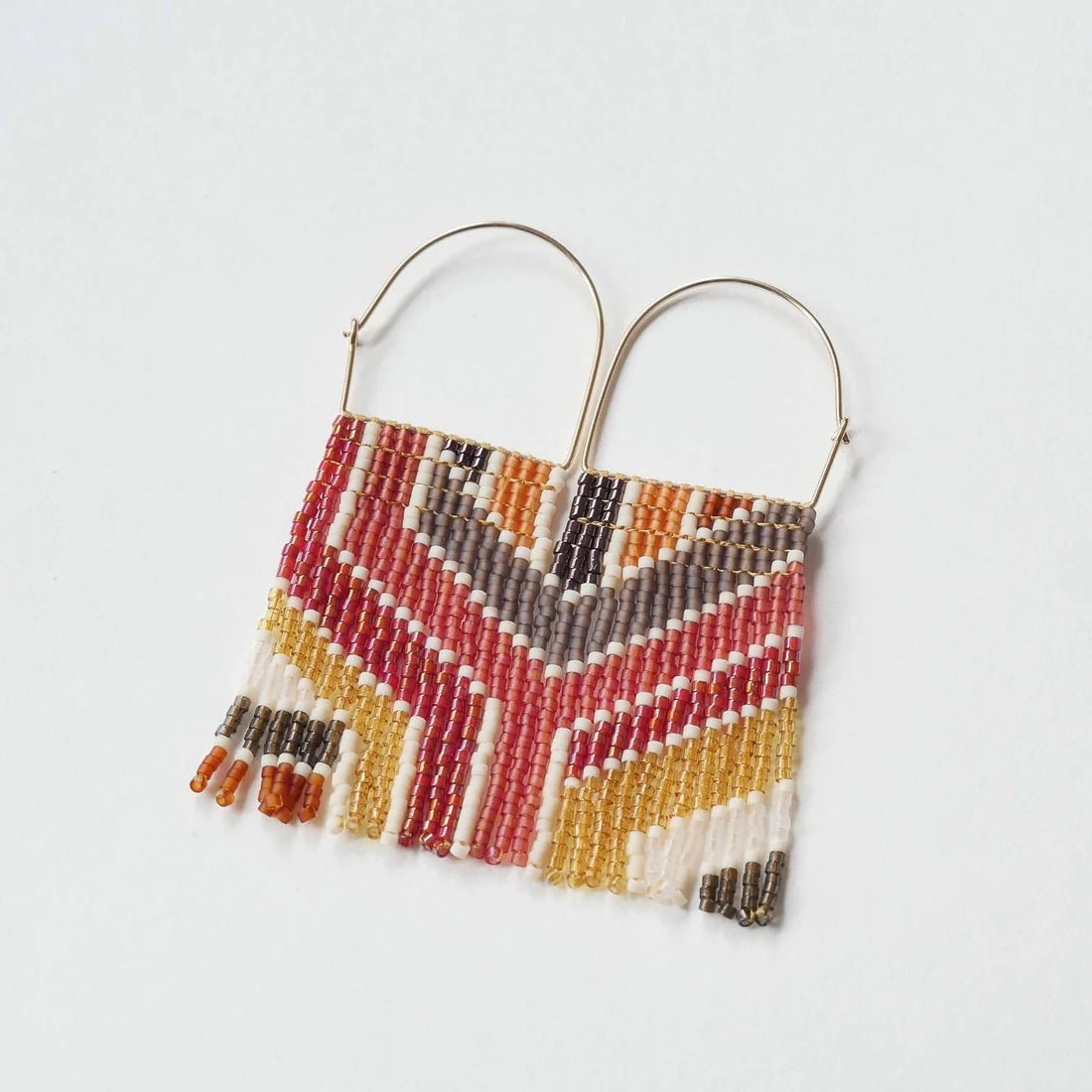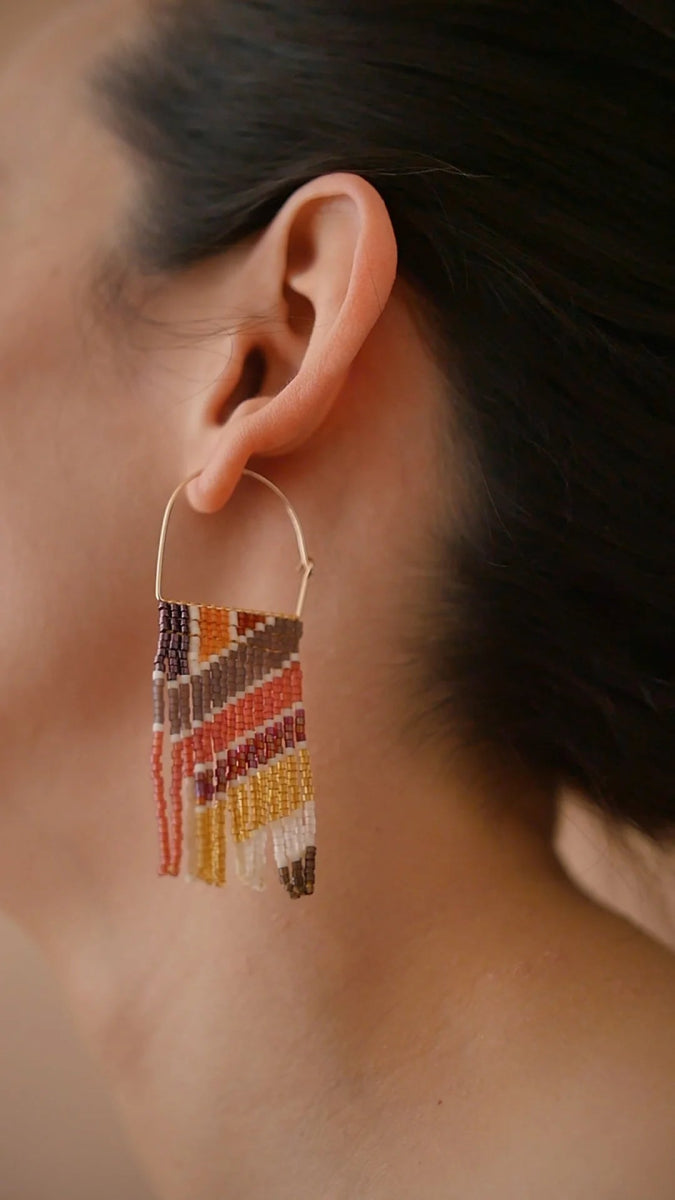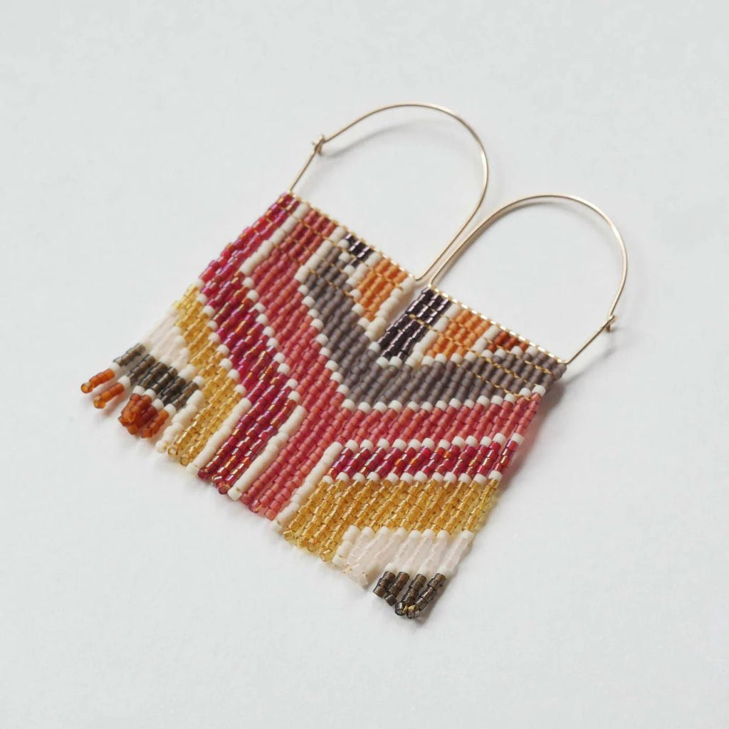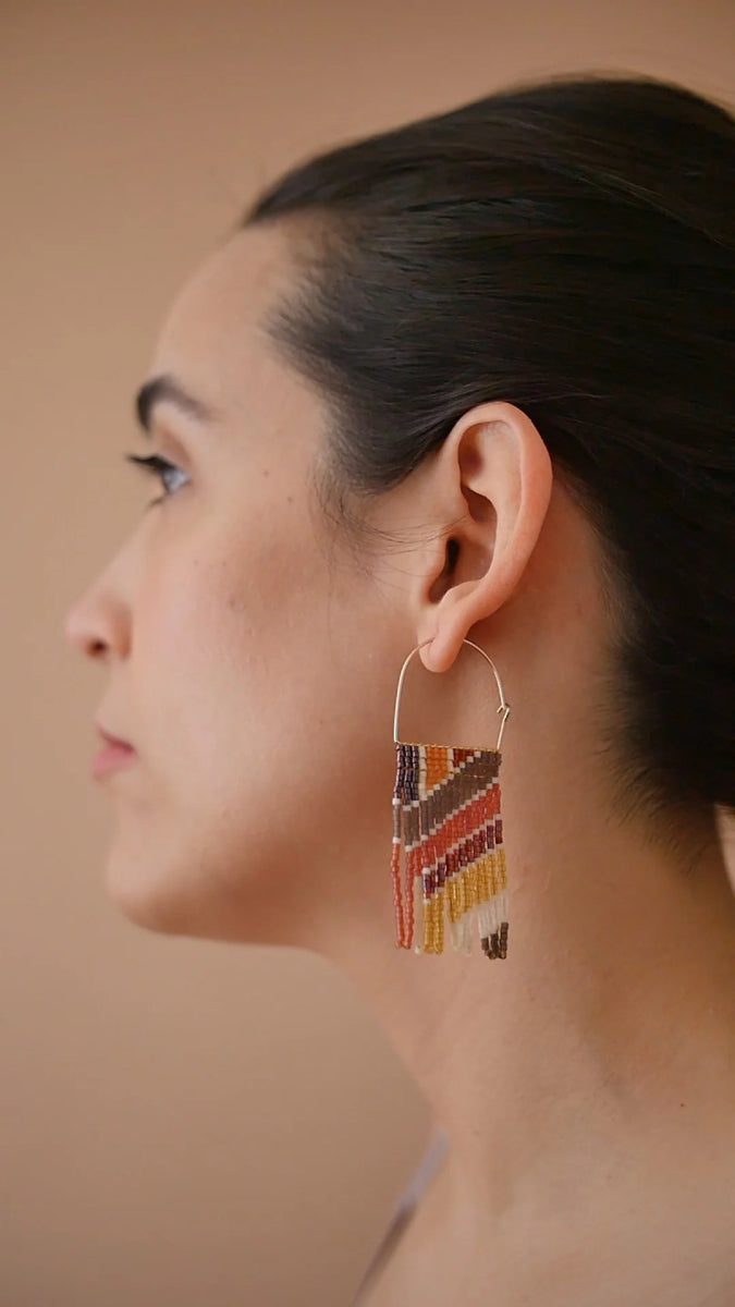 Tapestry style beaded earrings stitched on 14 KT gold-filled half-circle hoops.