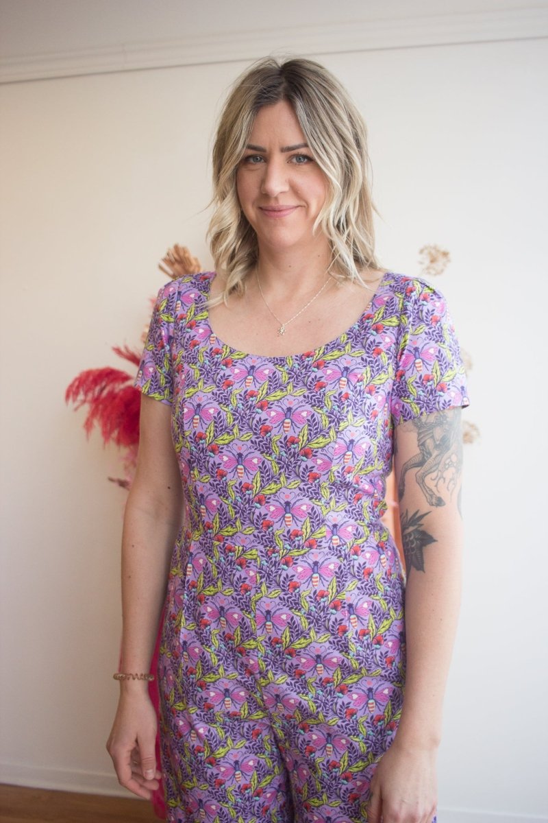The Whinchat by Birds of North America is the perfect jumpsuit for spring, with a cropped, wide leg, short sleeve and a lovely scooped neck! Complete with pockets in the pants, and it closes with a back invisible zipper. This joyful cotton print features candy-coloured winged insects among juicy lime green, coral and turquoise verdure on an iris coloured background.