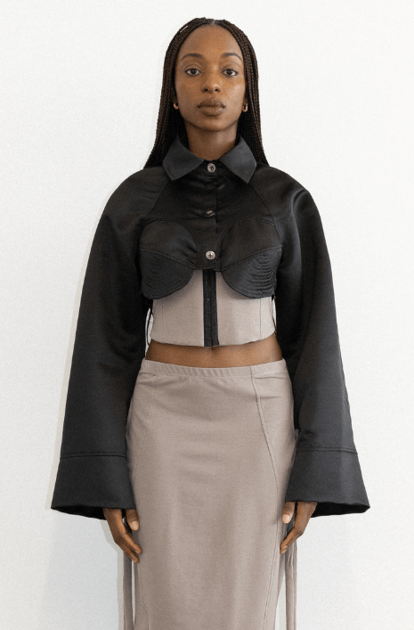 This fashion forward cropped satin jacket by Mercy House redefines structure with its bold and alluring silhouette. The Lair Cropped Jacket features exaggerated raglan sleeves, a tailored collar and a circular cup detailed stitching. It's architectural, alluring, and unapologetically cool. Pair it with high waisted trousers and a lace up chunky boot for a polished and modern streetwear look, or throw it over a slip dress for a look that's a more bold but just as refined.