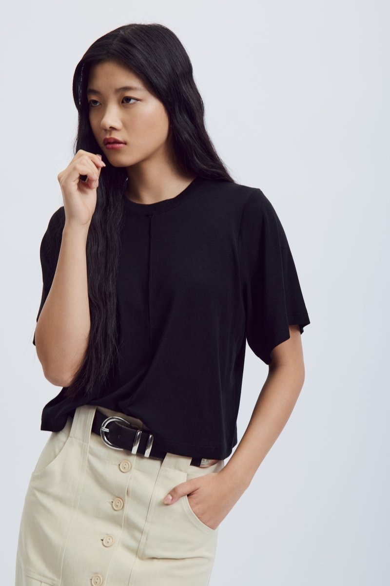 The Metis Top is a slightly loose elevated t-shirt with a subtle ribbed detail at the front, adding a touch of originality. Crafted from a blend of wool and lyocell, it offers an incomparable softness, combining comfort with exceptional quality. All made in Pealess fabric for unmatched durability.
